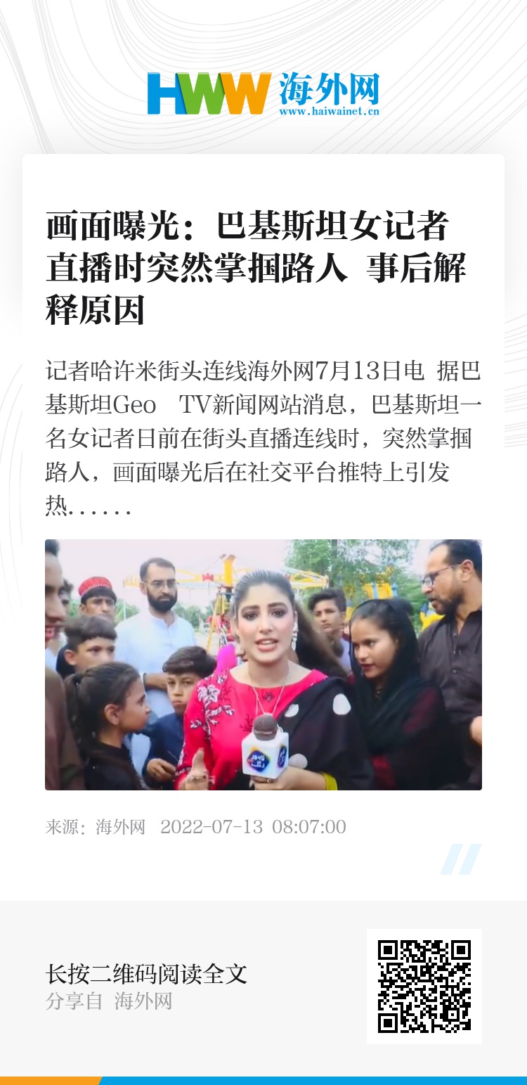 海外网7月13日电 据巴基斯坦Geo TV新闻网站消息,巴基斯坦一名女记者日前在街头直播连线时,突然掌掴路人,画面曝光后在社交平台推特上引发热议。