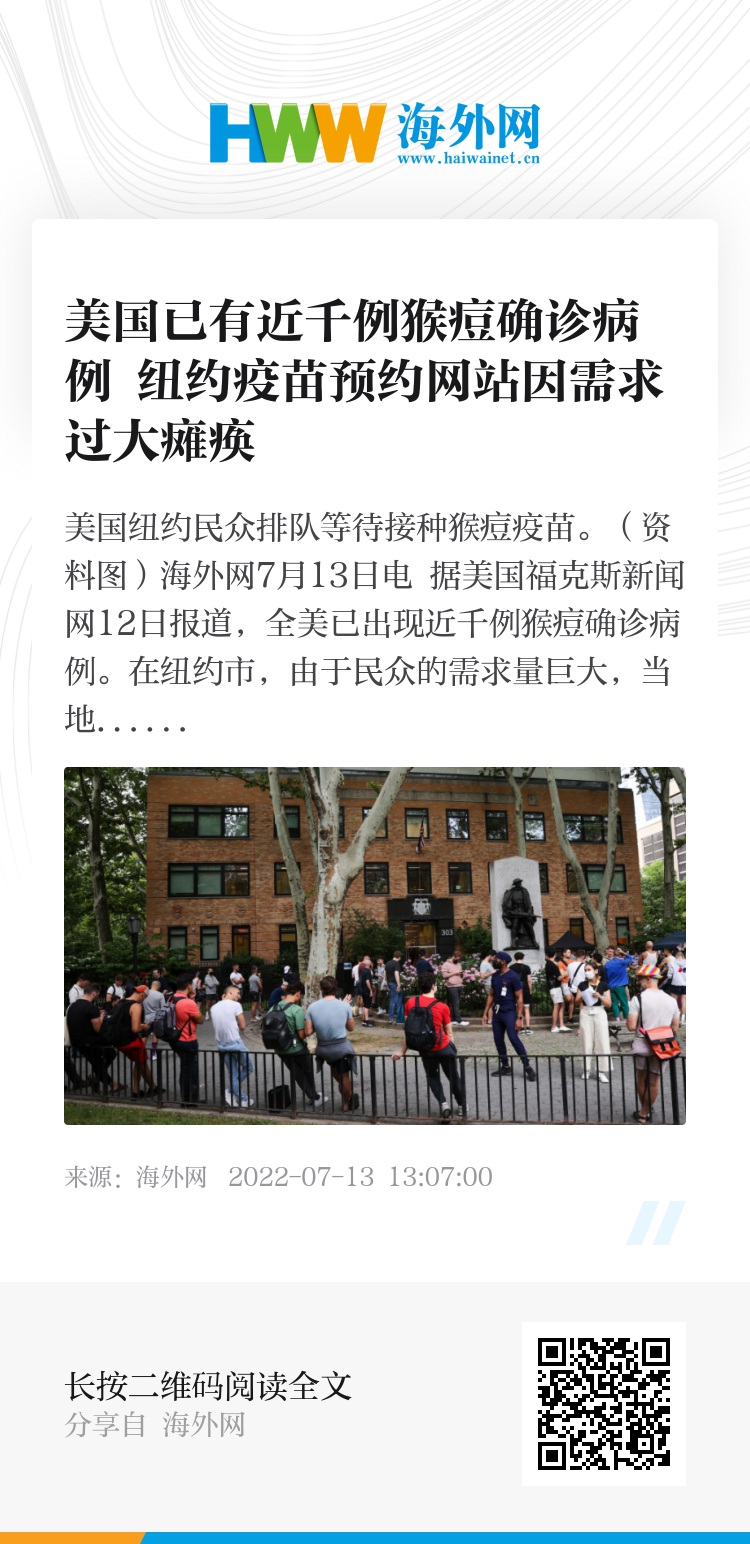 海外网7月13日电 据美国福克斯新闻网12日报道,全美已出现近千例猴痘确诊病例。在纽约市,由于民众的需求量巨大,当地的疫苗预约网站在几分钟内还出现了瘫痪的情况。