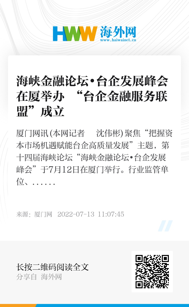 为进一步提升对台金融服务水平,论坛上,“台企金融服务联盟”正式成立,该联盟由金圆集团联合全国台企联金融工作委员会、两岸企业家峰会金融产业合作推进小组、厦门银行、金圆统一证券、两岸股交中心、圆信永丰基金、金美信消费金融、中国银行厦门市分行、台商海峡两岸产业投资基金共同发起。联盟成立后将与全国多地台办、台协、台青基地和台企建立深度服务关系。