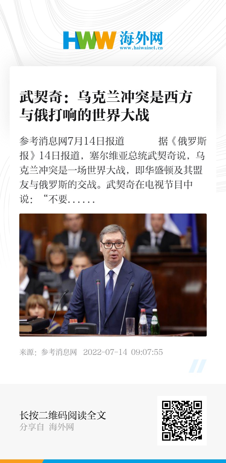 参考消息网7月14日报道 据《俄罗斯报》14日报道,塞尔维亚总统武契奇说,乌克兰冲突是一场世界大战,即华盛顿及其盟友与俄罗斯的交战。