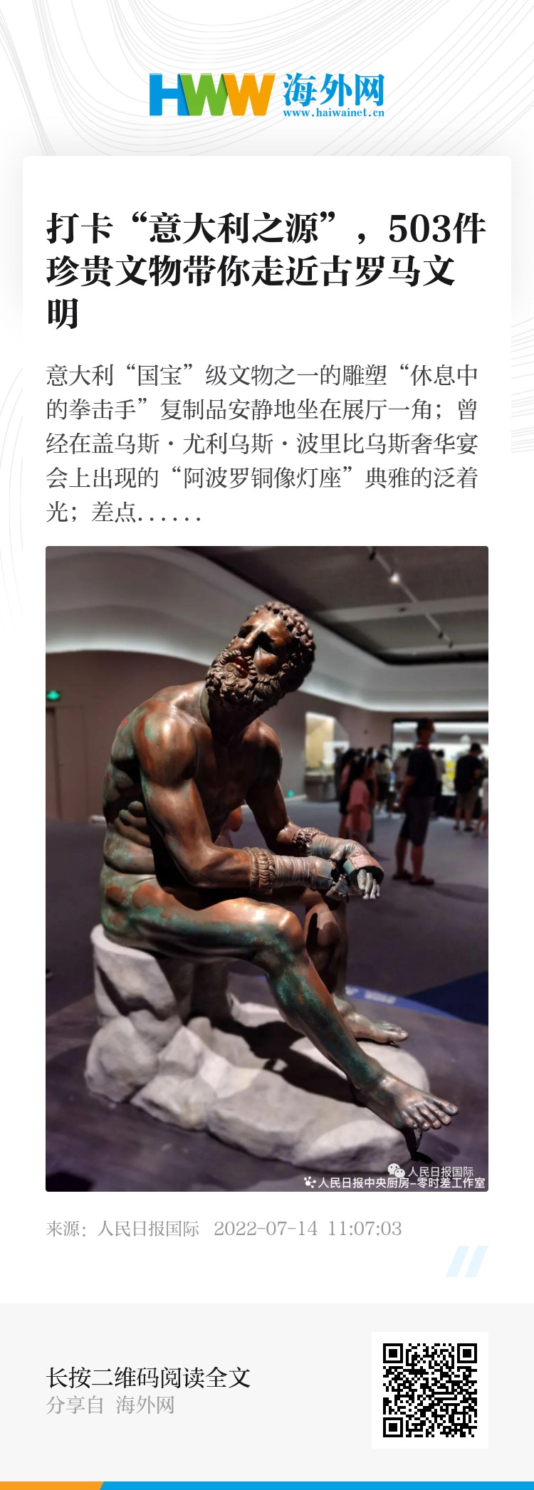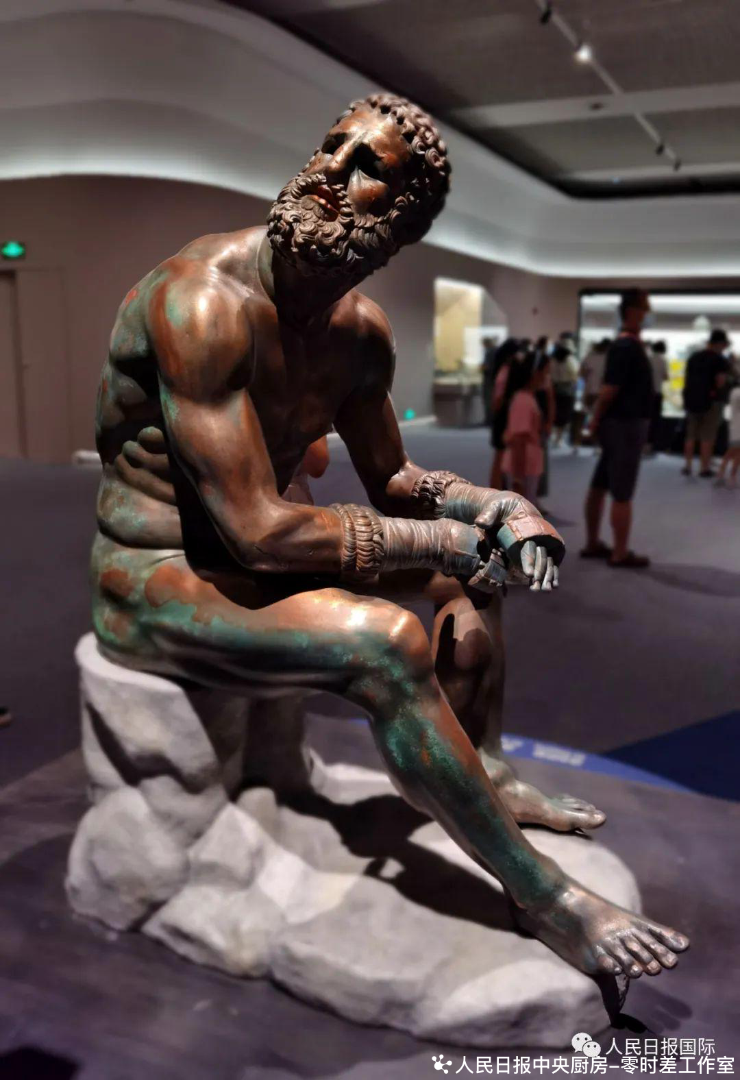 意大利“国宝”级文物之一的雕塑“休息中的拳击手”复制品安静地坐在展厅一角;曾经在盖乌斯·尤利乌斯·波里比乌斯奢华宴会上出现的“阿波罗铜像灯座”典雅的泛着光;差点因“伤情”无法展出的双涡旋柄高脚杯形酒缸静静伫立在展柜中……这些都是7月10日开幕的“意大利之源——古罗马文明展”的珍贵展品。