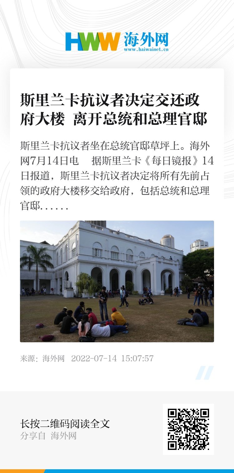 海外网7月14日电 据斯里兰卡《每日镜报》14日报道,斯里兰卡抗议者决定将所有先前占领的政府大楼移交给政府,包括总统和总理官邸。
