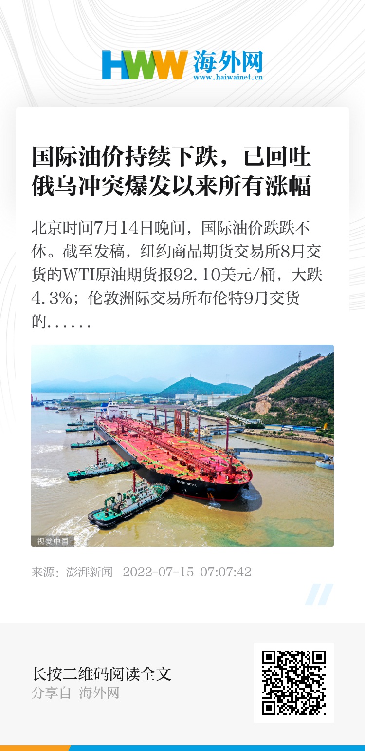 国贸期货宏观金融研究中心经理郑建鑫在分析报告中写道,国际能源署最新报告下调其对2022年和2023年石油需求的预估,因经济环境“恶化”,且道路燃料和石化需求尤其疲软。与此同时,拜登本周将出访沙特,有意敦促海湾国家增产石油,国际油价短期有所走弱。现阶段石油供需整体依旧偏紧,但也面临着海外经济下滑、中国疫情复发、美联储加息、OPEC+增产等一系列因素的扰动,价格波动加大。“欧美6月PMI、消费信心指数大幅回落,表明经济放缓压力持续加大,因此,尽管当前原油基本依旧强劲,但在全球努力对抗通胀的大背景下,原油首当其冲,将面临越来越大的压力。”(澎湃新闻记者 杨漾)