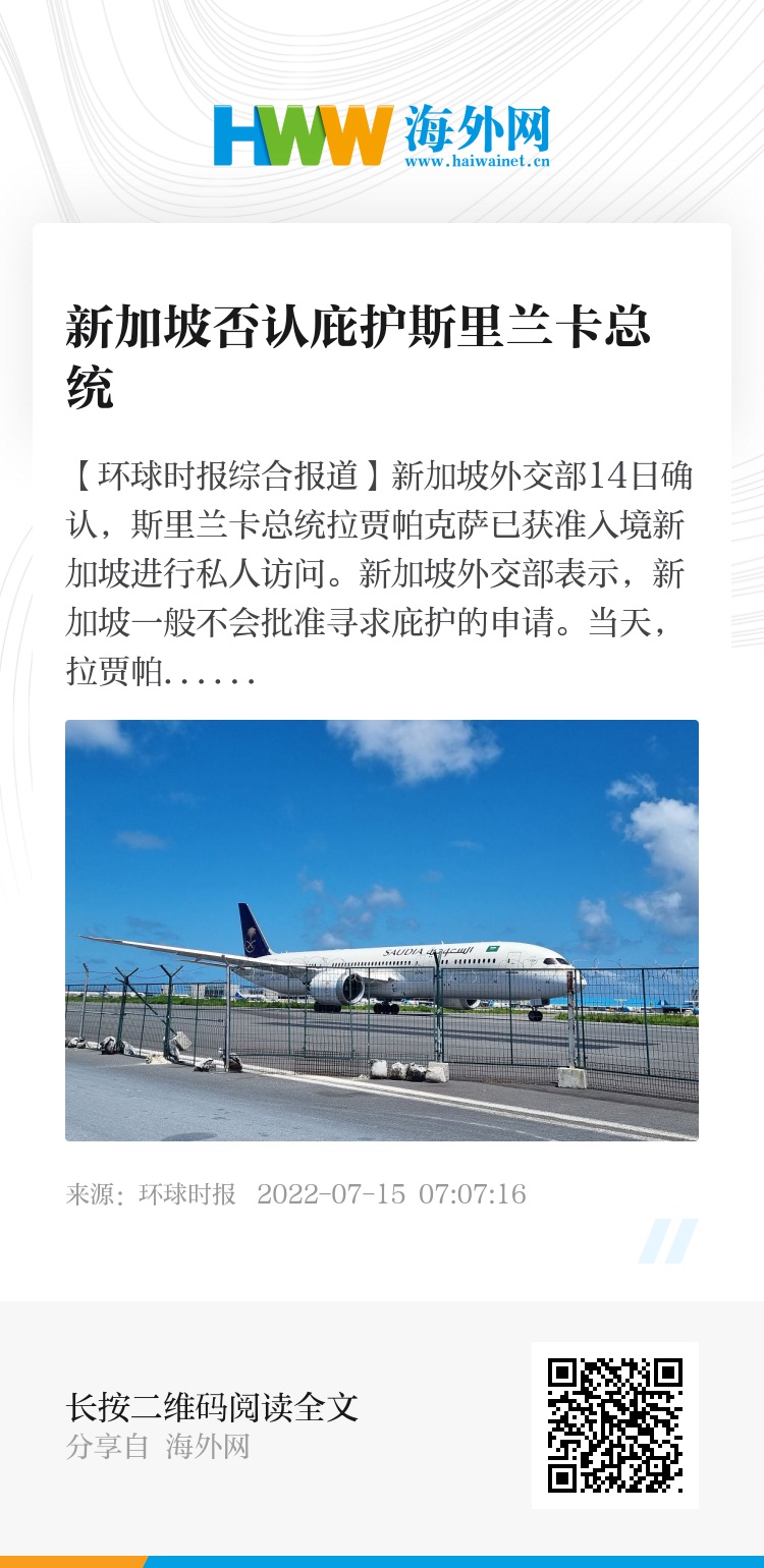 马尔代夫政府官员透露,拉贾帕克萨13日登上一架沙特航空公司的特殊航班前往新加坡,随后将前往沙特。