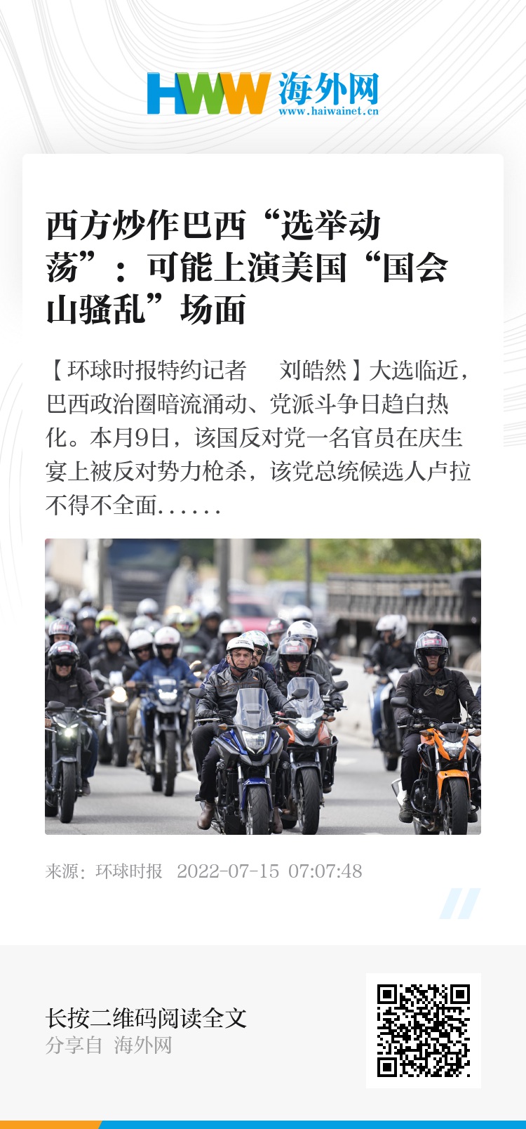 在西方媒体看来,巴西10月份的大选可谓危机四伏,层出不穷的骚乱事件充分说明该国的政治对立已经达到极度尖锐的程度。报道称,现任总统博索纳罗多次发表言论,甚至曾经暗示称不会接受选举失败的结局,并指控国家选举计票系统“有诈”。
