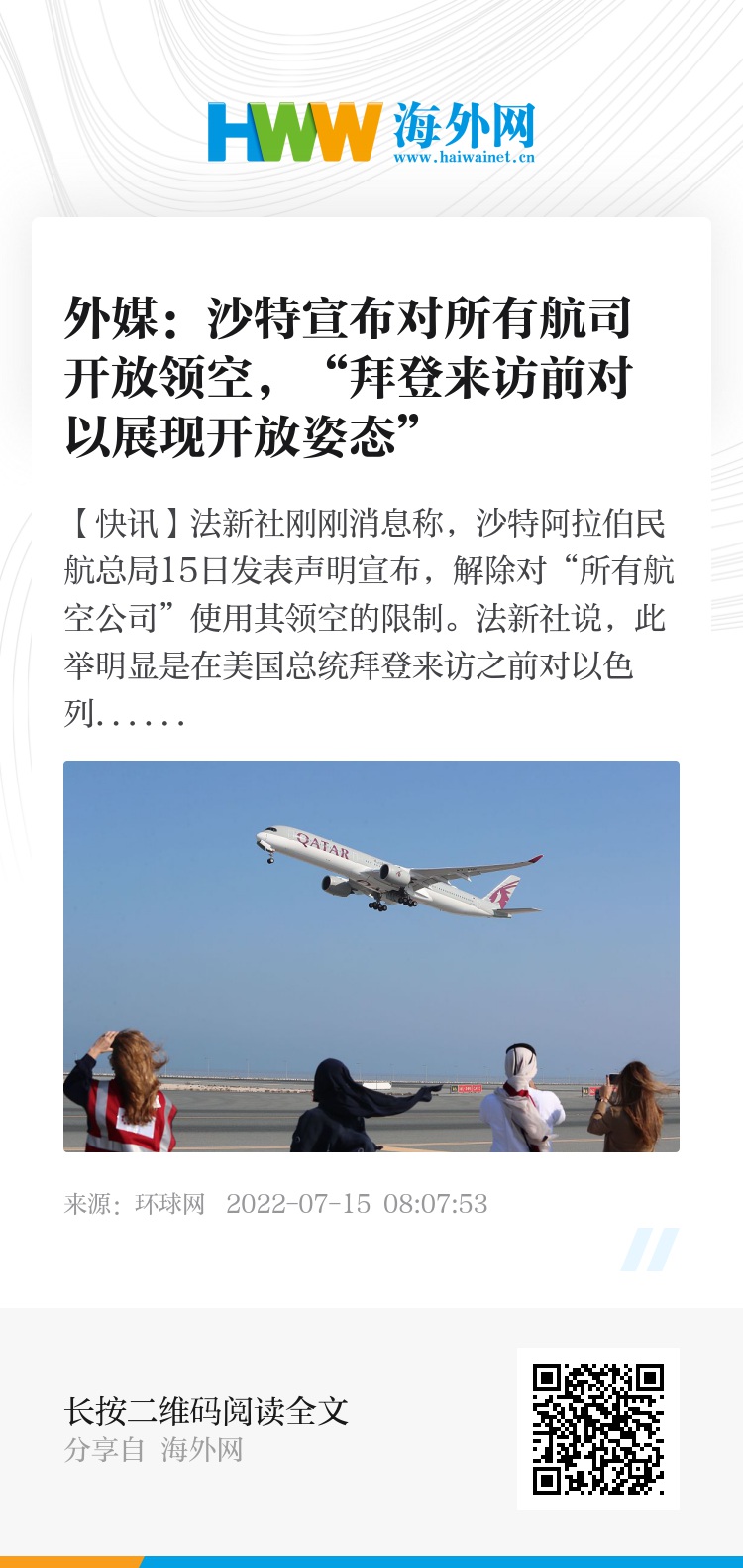 【环球网快讯】法新社刚刚消息称,沙特阿拉伯民航总局15日发表声明宣布,解除对“所有航空公司”使用其领空的限制。法新社说,此举明显是在美国总统拜登来访之前对以色列展现出开放姿态。