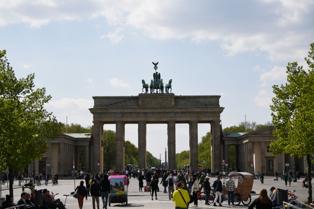 4月28日,游客在德国柏林勃兰登堡门东面的巴黎广场上游览。新华社记者任鹏飞摄
