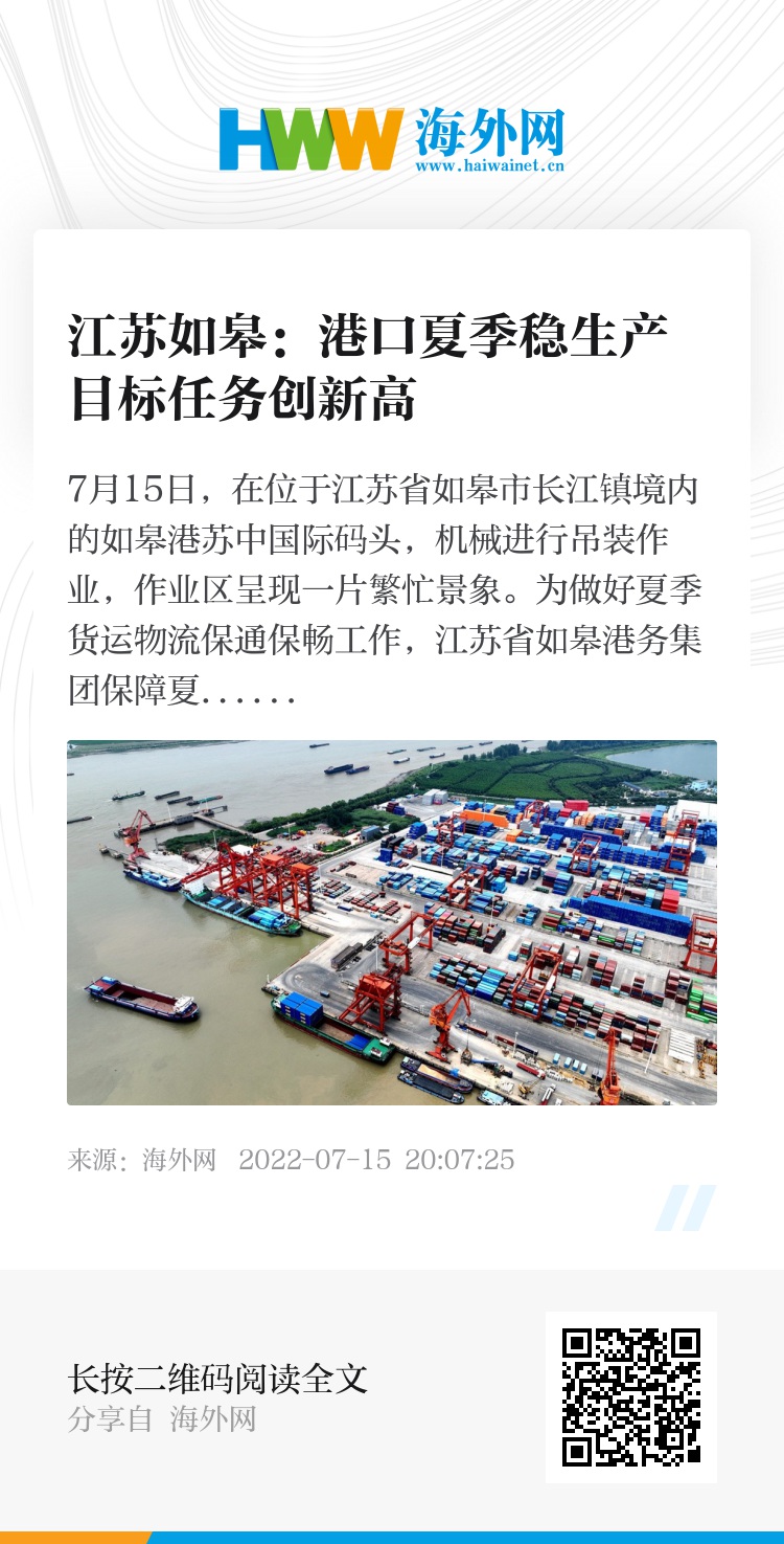 7月15日,在位于江苏省如皋市长江镇境内的如皋港苏中国际码头,机械进行吊装作业,作业区呈现一片繁忙景象。为做好夏季货运物流保通保畅工作,江苏省如皋港务集团保障夏季高温天气持续稳定生产,以更加畅通的港航物流服务保障民生物资及农业、能源、原材料等生产物资的运输畅通,确保产业链、供应链安全稳定。截止7月15日,江苏省如皋港务集团苏中国际码头今年完成货物吞吐量230.4万吨,同比增长0.09%;集装箱吞吐量30.6万标箱,同比去年同期增长6.8%,其中完成集装箱外贸吞吐量3.8万标箱,同比去年同期上升13.1。图片来源:IC photo