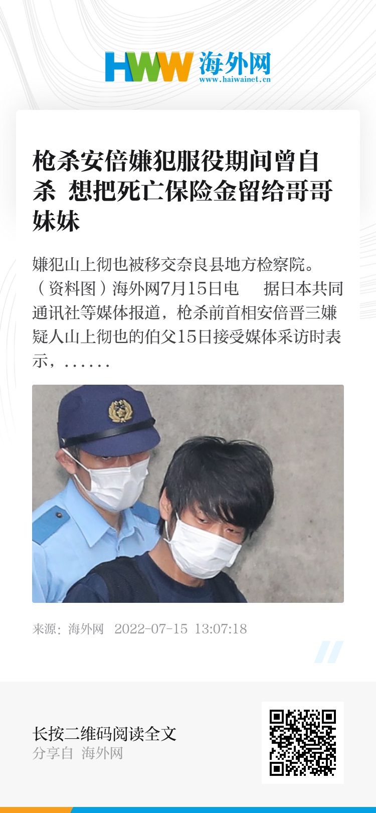 海外网7月15日电 据日本共同通讯社等媒体报道,枪杀前首相安倍晋三嫌疑人山上彻也的伯父15日接受媒体采访时表示,山上在自卫队服役期间曾试图自杀,希望把死亡保险金留给哥哥和妹妹。