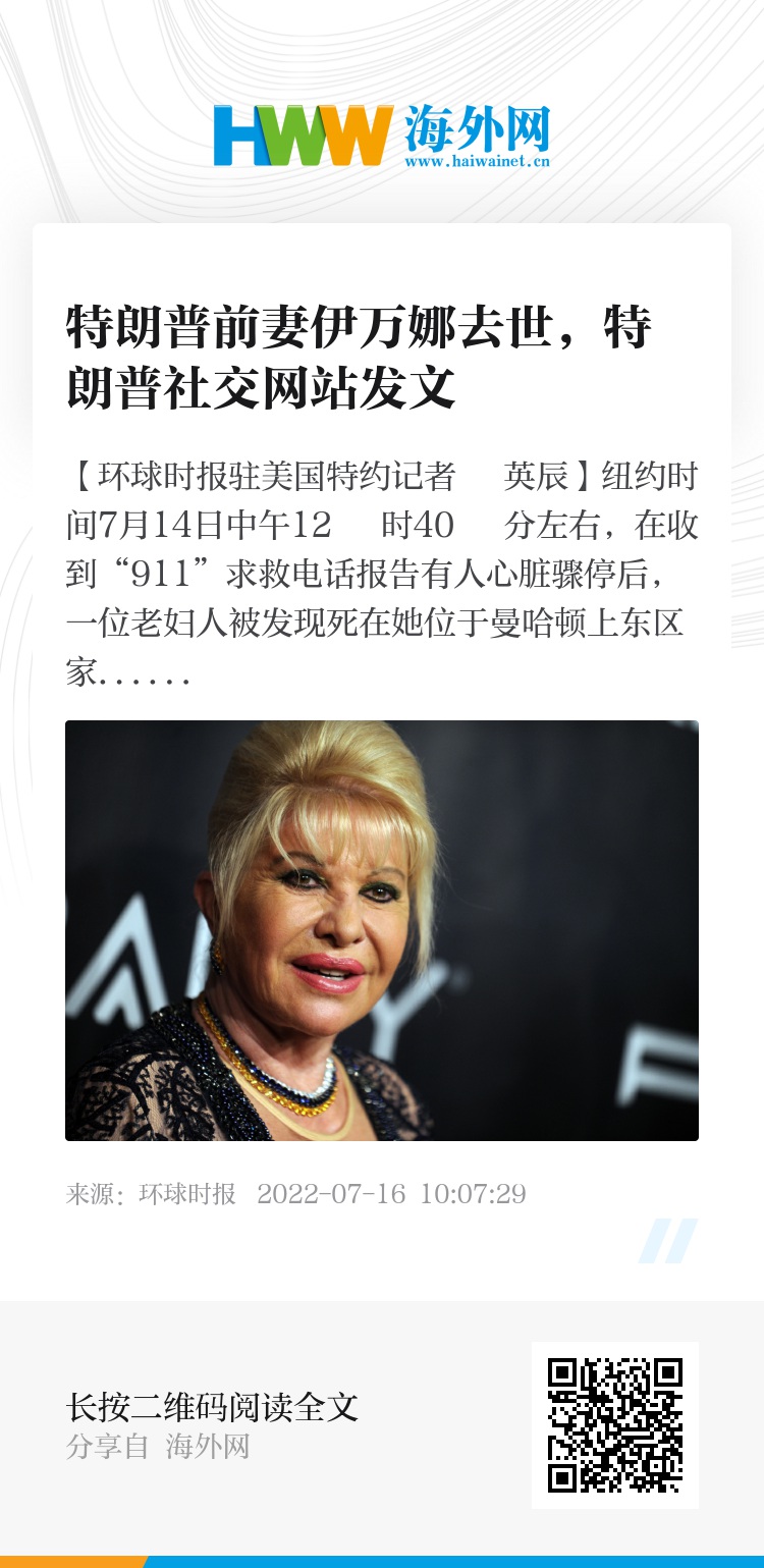 【环球时报驻美国特约记者 英辰】纽约时间7月14日中午12 时40 分左右,在收到“911”求救电话报告有人心脏骤停后,一位老妇人被发现死在她位于曼哈顿上东区家中的楼梯底下。她就是美国前总统特朗普的第一任妻子伊万娜·特朗普,享年73岁。
