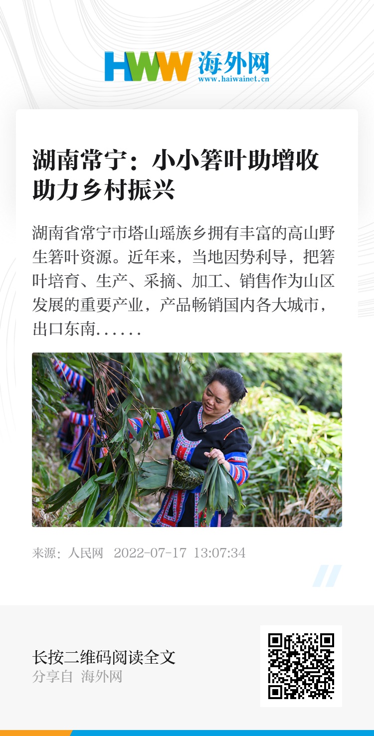 湖南省常宁市塔山瑶族乡拥有丰富的高山野生箬叶资源。近年来,当地因势利导,把箬叶培育、生产、采摘、加工、销售作为山区发展的重要产业,产品畅销国内各大城市,出口东南亚、日韩等国家。小小箬叶走出大山,有效助农增收致富,助力乡村振兴。周秀鱼春摄(人民图片网)