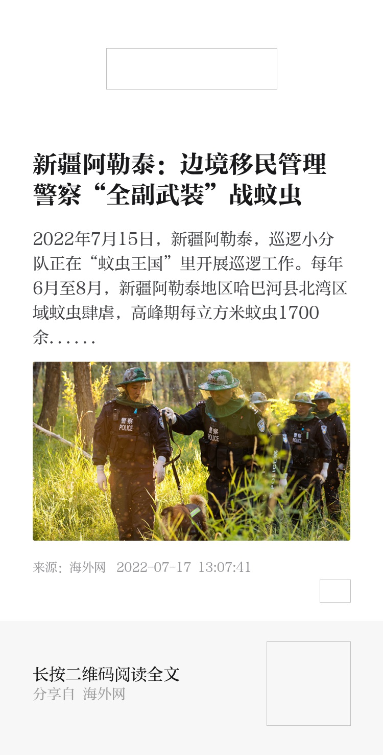 2022年7月15日,新疆阿勒泰,巡逻小分队正在“蚊虫王国”里开展巡逻工作。每年6月至8月,新疆阿勒泰地区哈巴河县北湾区域蚊虫肆虐,高峰期每立方米蚊虫1700余只,这里被誉为世界四大“蚊虫王国”之一。连日来,驻守在这里的新疆出入境边防检查总站阿勒泰边境管理支队科克托海中心边境警务站移民管理警察,他们战蚊虫、斗酷暑,通过车巡和步巡的方式,用脚步丈量着祖国边境线,用行动守卫着祖国边境线的安宁与稳定。(供图:视觉中国)