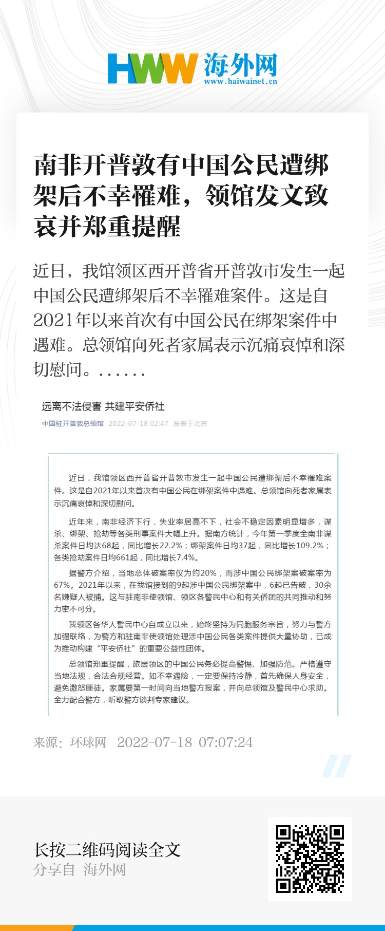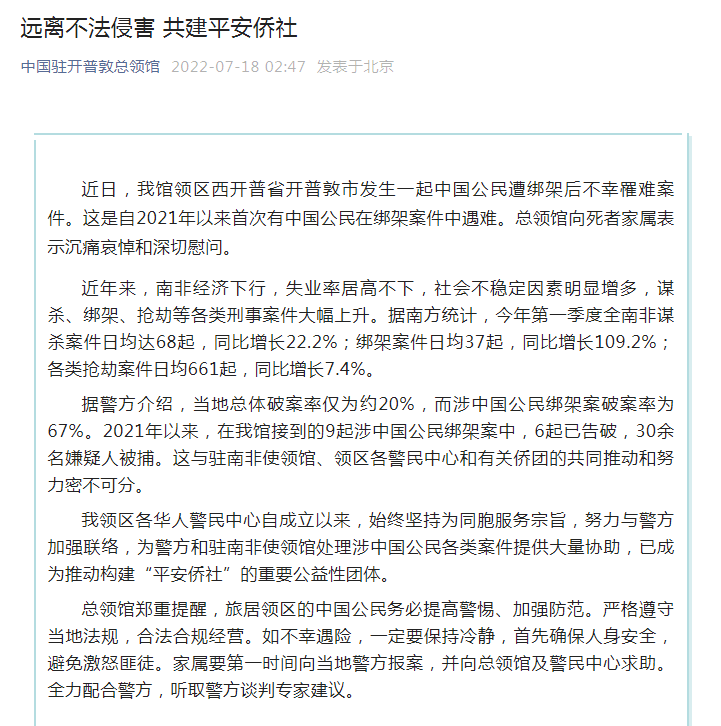 近日,我馆领区西开普省开普敦市发生一起中国公民遭绑架后不幸罹难案件。这是自2021年以来首次有中国公民在绑架案件中遇难。总领馆向死者家属表示沉痛哀悼和深切慰问。