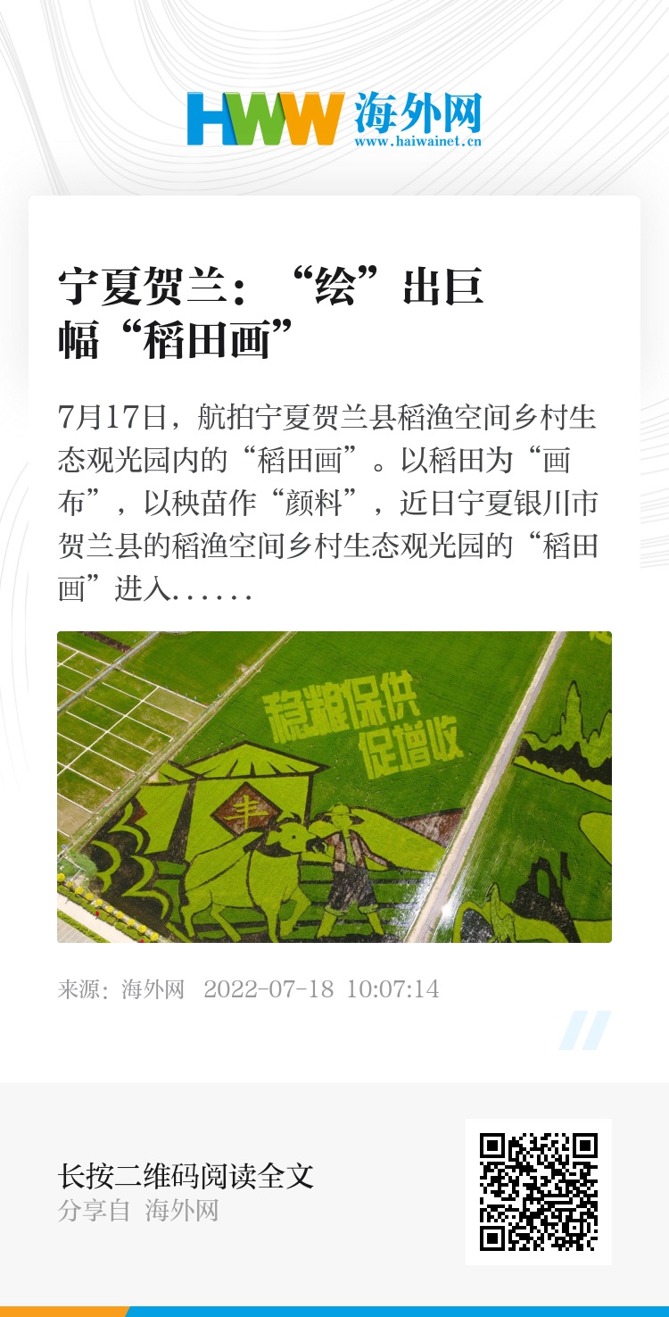 7月17日,航拍宁夏贺兰县稻渔空间乡村生态观光园内的“稻田画”。以稻田为“画布”,以秧苗作“颜料”,近日宁夏银川市贺兰县的稻渔空间乡村生态观光园的“稻田画”进入最佳观赏期,园内题材多样的稻田画成为一道别致的乡村景观。(无人机照片)中新社记者 于晶 摄 图片来源:cnsphoto/IC photo
