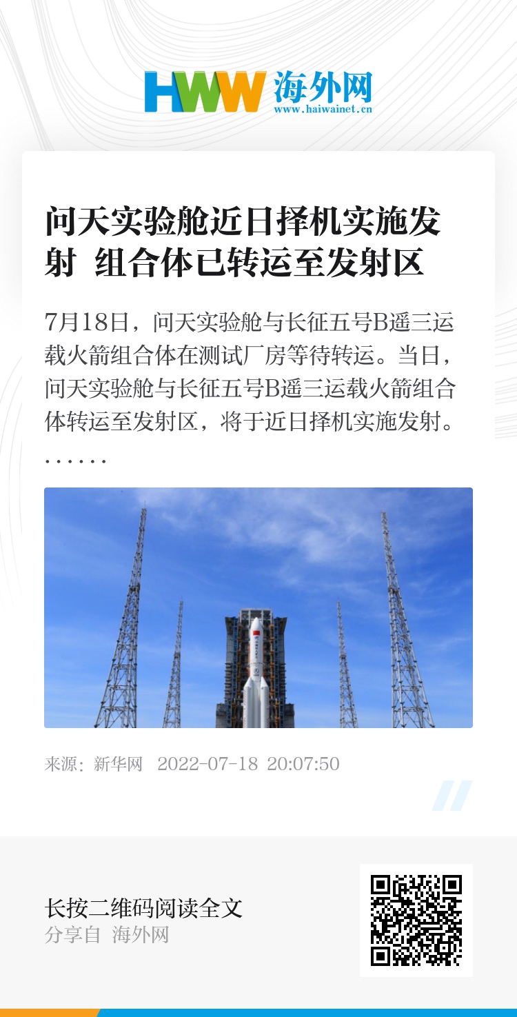 32459086,.问天实验舱近日择机实施发射 组合体已转运至发射区,.2022-07-18 20:13:50,.204524,.庄鹏泽