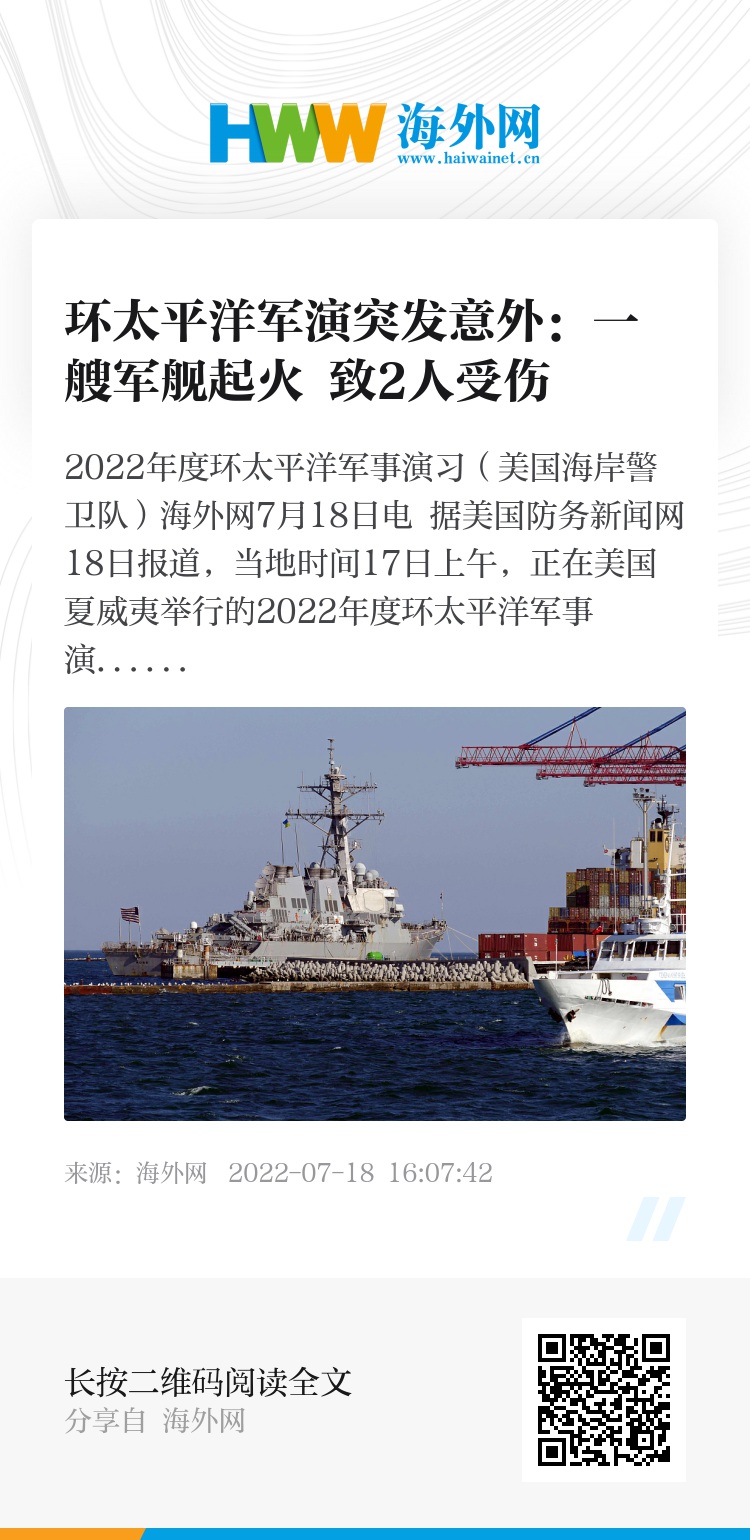 海外网7月18日电 据美国防务新闻网18日报道,当地时间17日上午,正在美国夏威夷举行的2022年度环太平洋军事演习突发意外,一艘军舰发生火灾,造成两名水手受伤。事发军舰为一艘秘鲁船只。