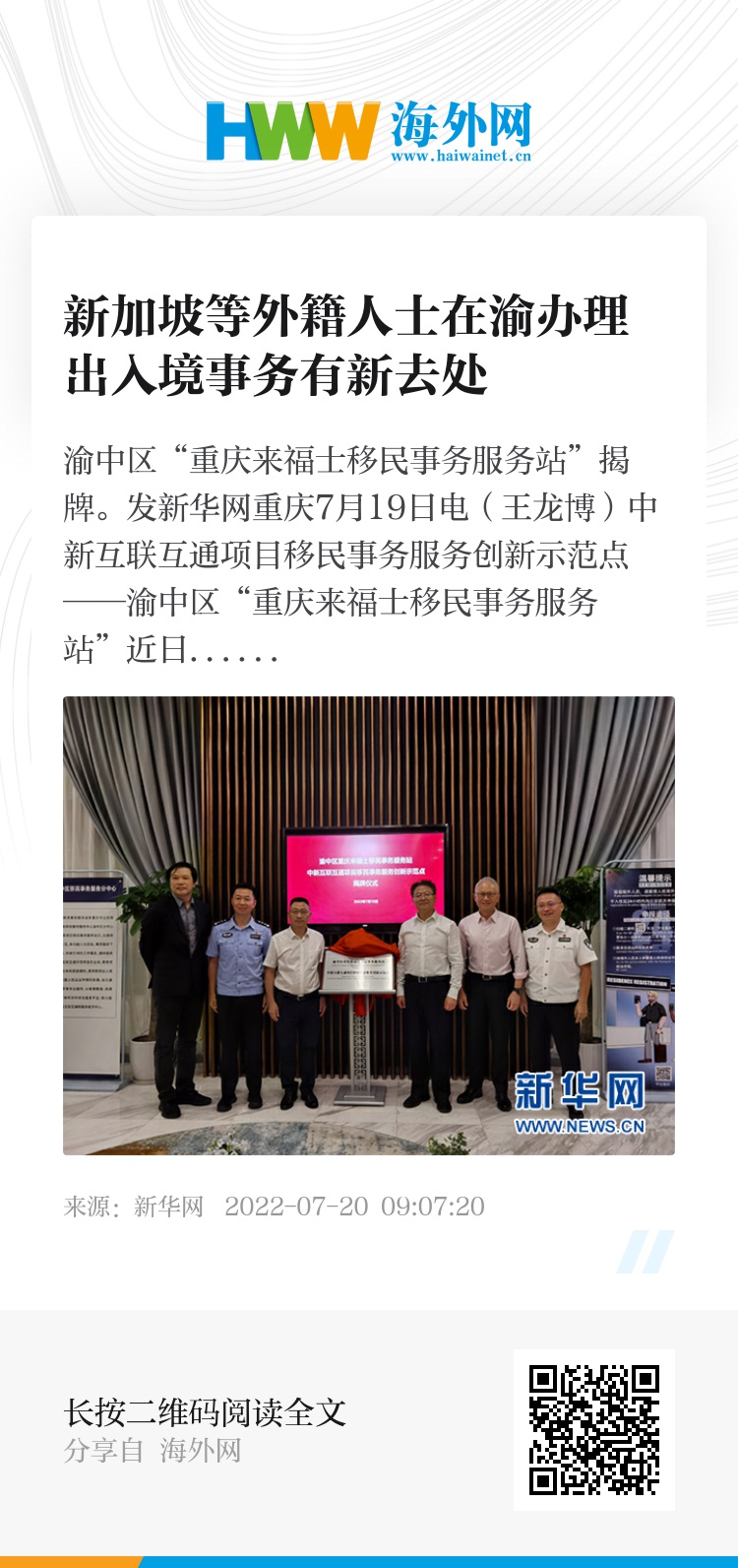 据了解,“重庆来福士移民事务服务站”由重庆市中新示范项目管理局、重庆市公安局出入境管理局和中国新加坡商会重庆分会共同推动打造,旨在便利新加坡及其他国(境)外人士在渝办理出入境手续、畅通国(境)内外往来交流、优化重庆营商环境。该服务站集合了重庆相关部门审批职能,由中国新加坡商会重庆分会提供对接服务,可为新加坡及其他国(境)外人士提供出入境政策咨询,签证、停居留等相关证件办理,法律咨询、语言文化服务和车驾管、民政、交通、医疗、旅游、通讯、金融等一站式免费综合服务,能有效减省办理出入境手续的流程和时间,并帮助有需要的外籍人士解决语言沟通等问题。