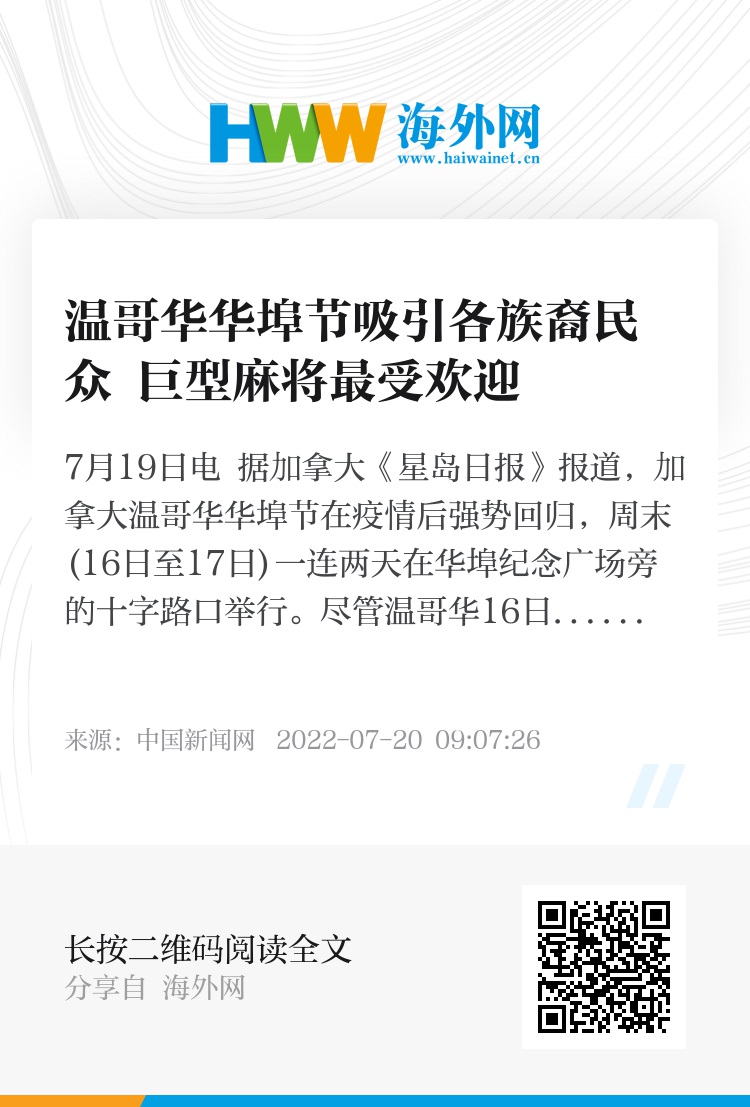 中新网7月19日电 据加拿大《星岛日报》报道,加拿大温哥华华埠节在疫情后强势回归,周末(16日至17日)一连两天在华埠纪念广场旁的十字路口举行。尽管温哥华16日下午出现骤雨,但无阻各族裔民众前往参与华埠庆典的兴致。