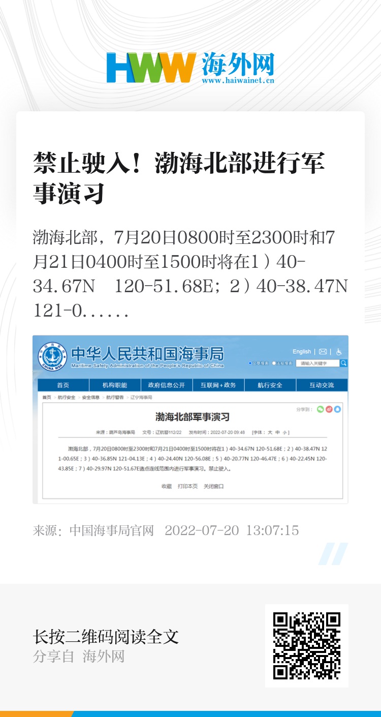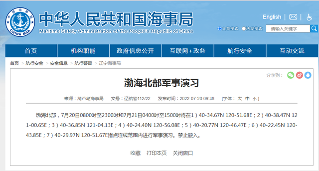 渤海北部,7月20日0800时至2300时和7月21日0400时至1500时将在1)40-34.67N 120-51.68E;2)40-38.47N 121-00.65E;3)40-36.85N 121-04.13E;4)40-24.40N 120-56.08E;5)40-20.77N 120-46.47E;6)40-22.45N 120-43.85E;7)40-29.97N 120-51.67E诸点连线范围内进行军事演习。禁止驶入。
