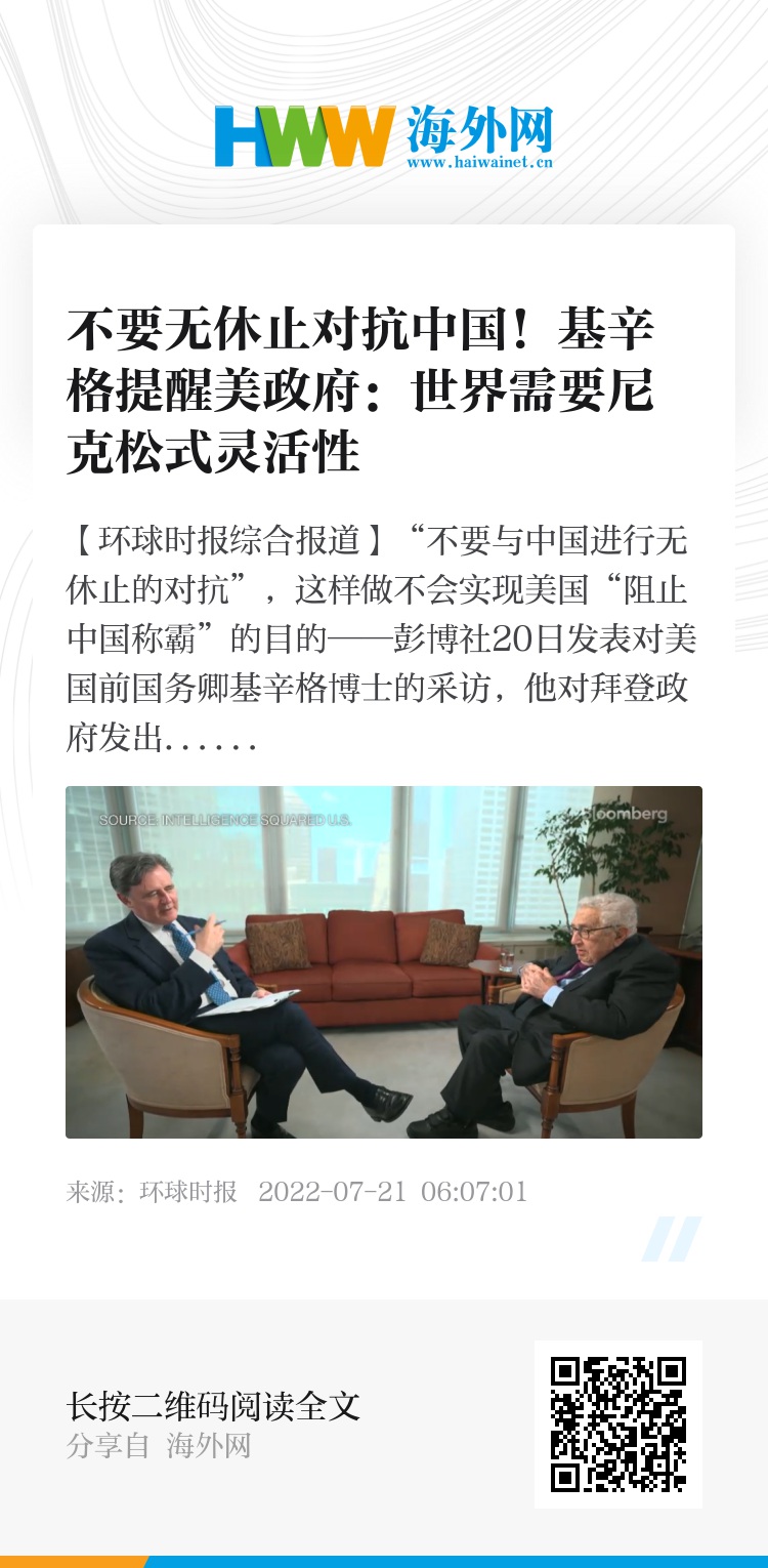德国《明镜周刊》7月15日发表对基辛格的专访,也谈及中美关系。报道称,在俄乌冲突爆发前,关于美国是否应该“接近俄罗斯以对付中国”的争论一直存在。现在的问题是,面对俄罗斯的威胁,华盛顿是否应该缓和与北京的紧张关系——就像尼克松政府在50年前所做的那样。当被问及“你认为美国是否足够强大,可以同时对付两个最大对手”时,基辛格表示:“如果对付两个对手意味着将乌克兰战争扩大为对俄罗斯的战争,同时将中国置于极端敌对的地位,我认为这是非常不明智的做法。”