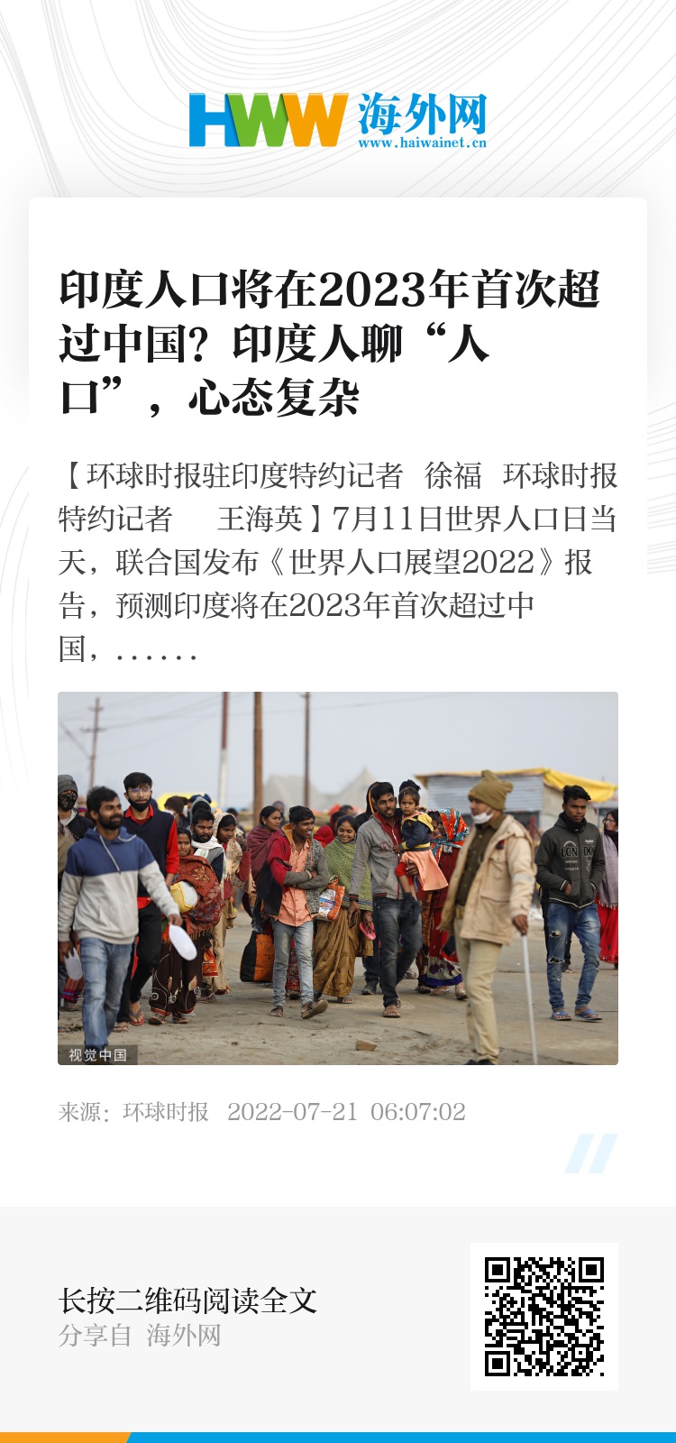 【环球时报驻印度特约记者 徐福 环球时报特约记者 王海英】7月11日世界人口日当天,联合国发布《世界人口展望2022》报告,预测印度将在2023年首次超过中国,成为全球第一人口大国。消息传出后,印度媒体和民众对此进行热烈讨论。有人认为,这份报告预示印度的“大国梦”即将实现,也有人开始严肃分析,人口爆炸将给印带来更多机会,还是更多挑战。