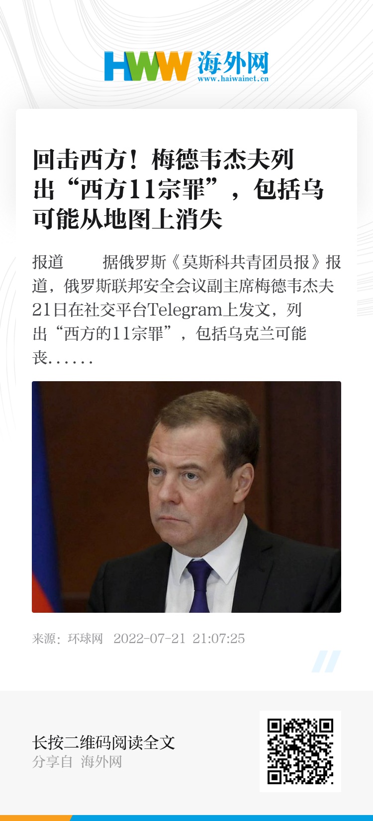 环球网报道 据俄罗斯《莫斯科共青团员报》报道,俄罗斯联邦安全会议副主席梅德韦杰夫21日在社交平台Telegram上发文,列出“西方的11宗罪”,包括乌克兰可能丧失剩余的国家主权并从世界地图上消失。他还写道,这“11宗罪”不是俄罗斯的错。