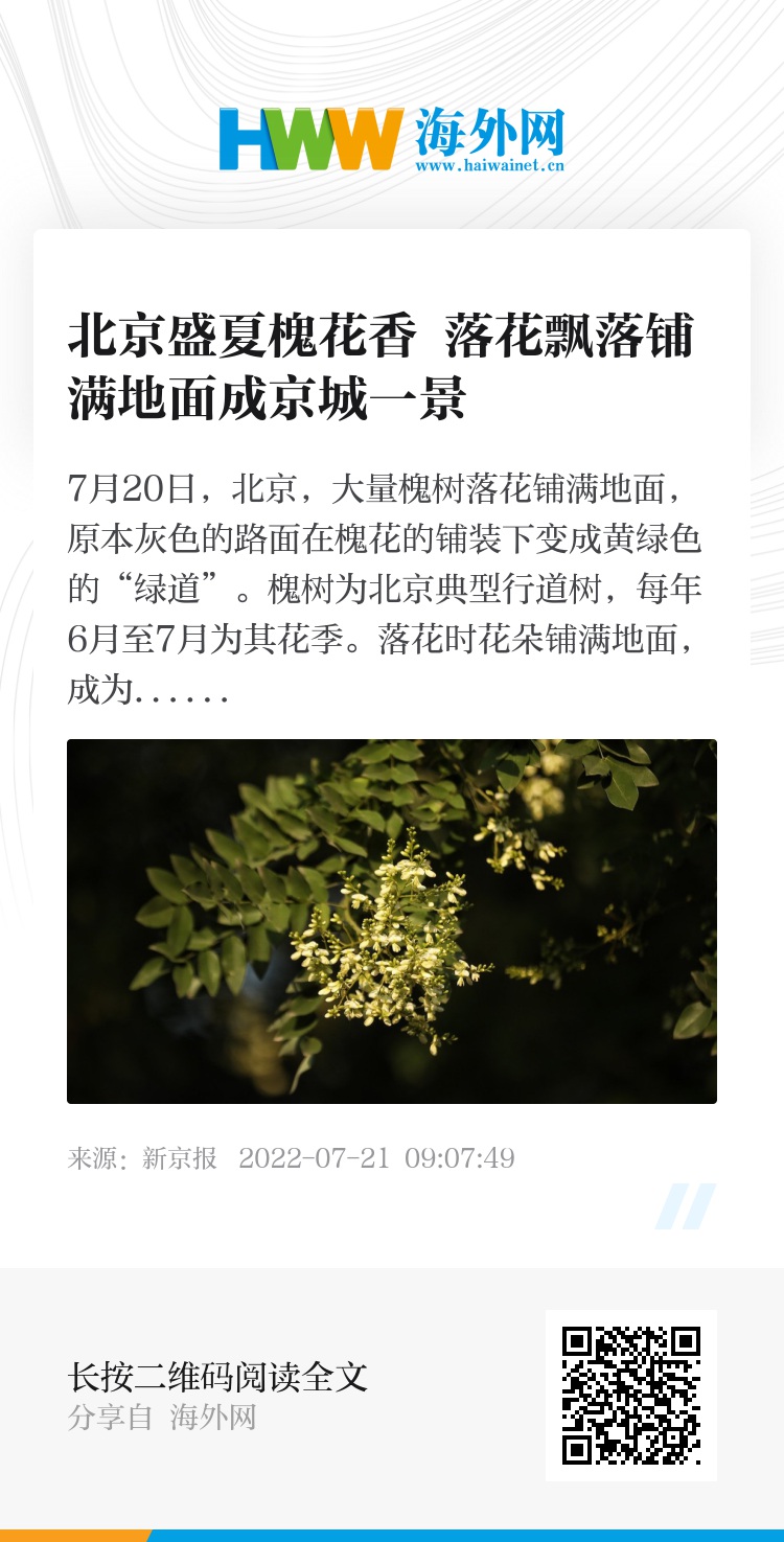 7月20日,北京,大量槐树落花铺满地面,原本灰色的路面在槐花的铺装下变成黄绿色的“绿道”。槐树为北京典型行道树,每年6月至7月为其花季。落花时花朵铺满地面,成为北京一景。新京报记者 王嘉宁 摄影报道。