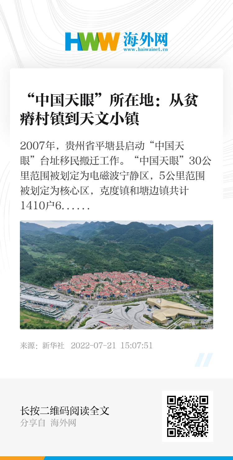 2007年,贵州省平塘县启动“中国天眼”台址移民搬迁工作。“中国天眼”30公里范围被划定为电磁波宁静区,5公里范围被划定为核心区,克度镇和塘边镇共计1410户6633名村民搬出大山。依托“中国天眼”,平塘县克度镇从2015年9月开始动工建设以科普为主题的特色天文小镇。目前,投入使用的项目有天文时空塔、天文体验馆与天文观测演示等20余个。很多当年搬出大山的村民在天文小镇上就业、创业。从贫瘠村镇到天文小镇,克度镇依托“中国天眼”完成了华丽蜕变。(新华社记者 欧东衢 摄)
