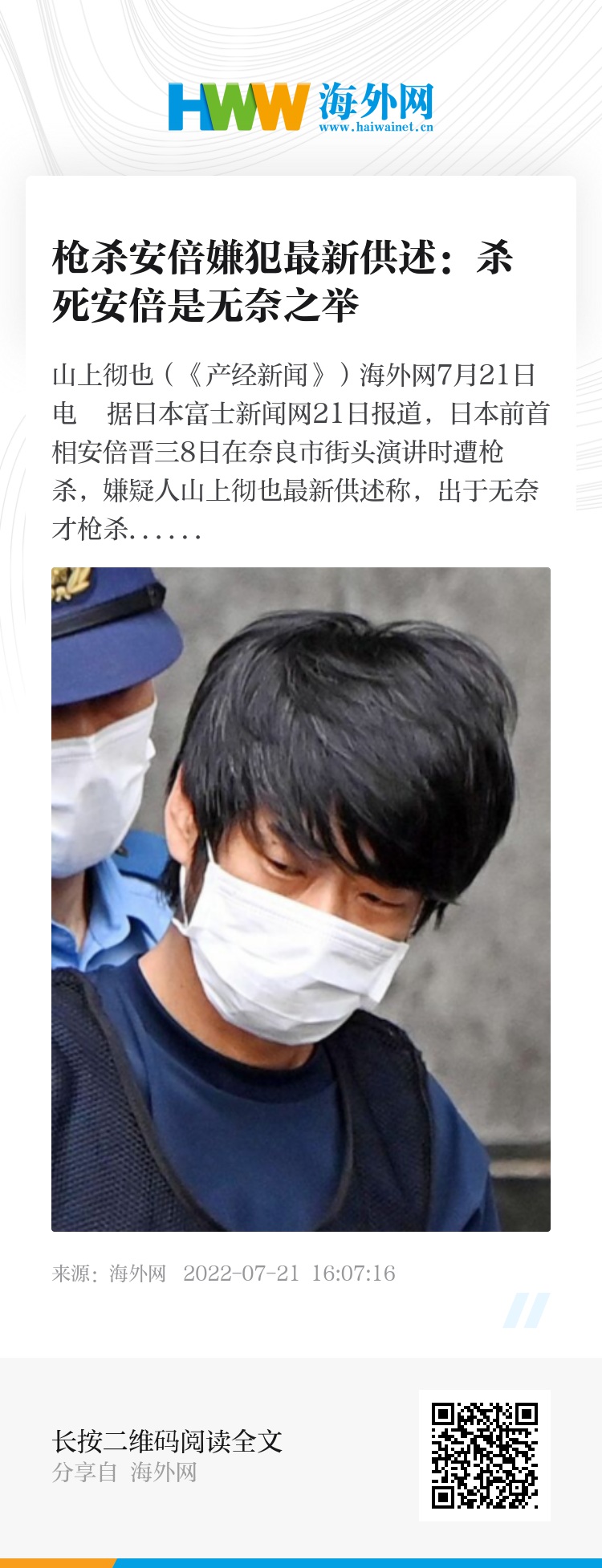 海外网7月21日电 据日本富士新闻网21日报道,日本前首相安倍晋三8日在奈良市街头演讲时遭枪杀,嫌疑人山上彻也最新供述称,出于无奈才枪杀安倍。