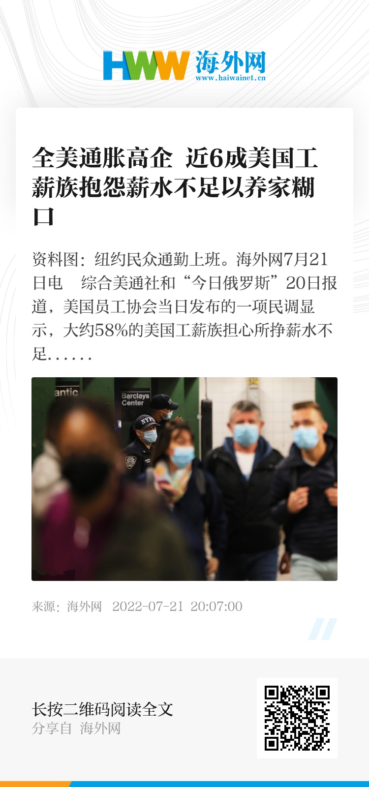 海外网7月21日电 综合美通社和“今日俄罗斯”20日报道,美国员工协会当日发布的一项民调显示,大约58%的美国工薪族担心所挣薪水不足以养活自己及家人。对于西班牙裔工人(69%)和有未成年子女需要抚养的父母(66%),这一数字甚至更高。