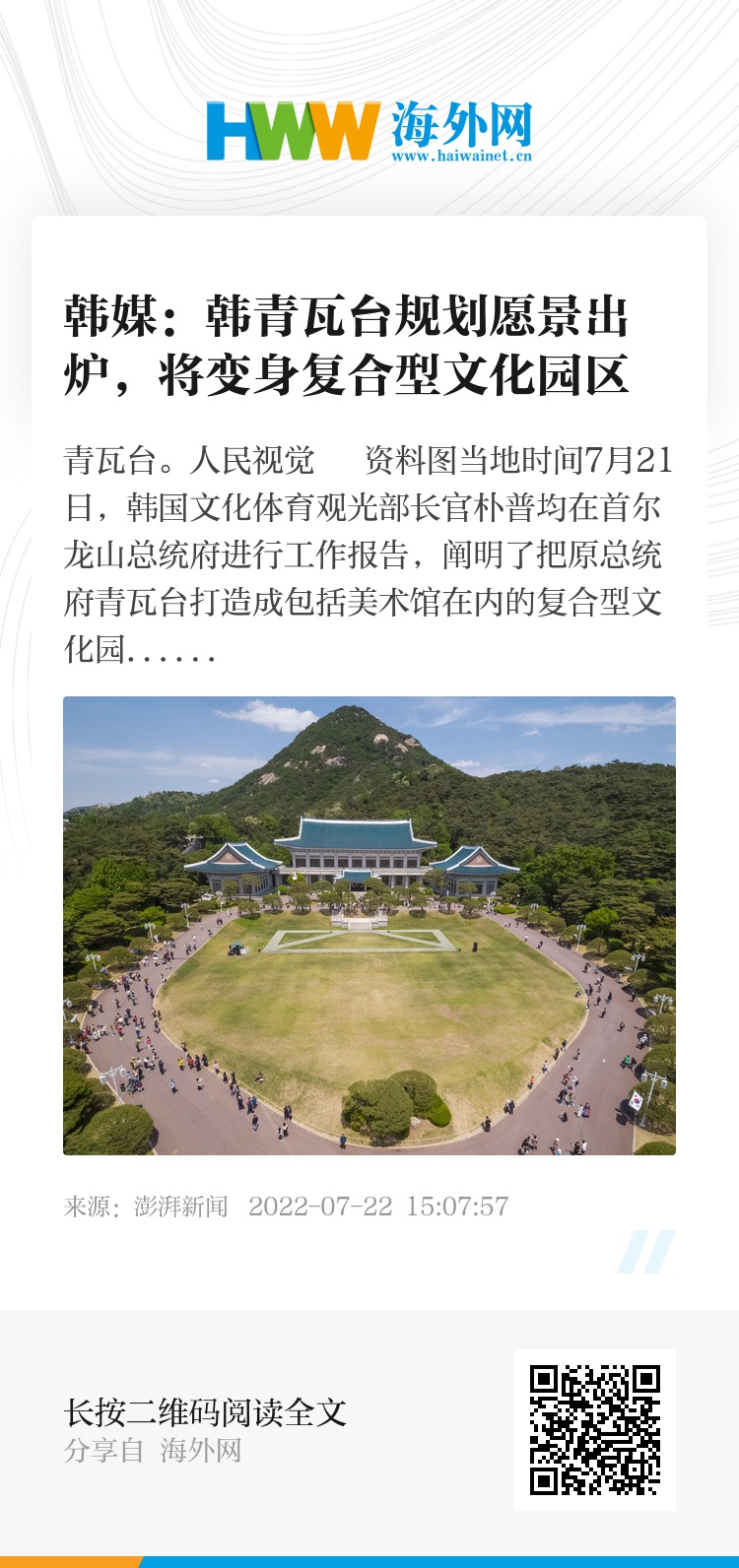 据韩联社7月21日报道,朴普均7月20日曾表示,青瓦台现由文化财厅(文物局)临时管理,其第一阶段愿景是对外开放。在第二阶段,文体部将主导把青瓦台打造为融文艺、自然、历史于一体的地标。青瓦台藏有600件美术品,积淀着历届总统的痕迹,种有5万多棵树木,枕流阁、五云亭等古建筑星罗棋布,文体部将利用上述优势,打造艺术综合体、总统历史文化空间、植物园等。