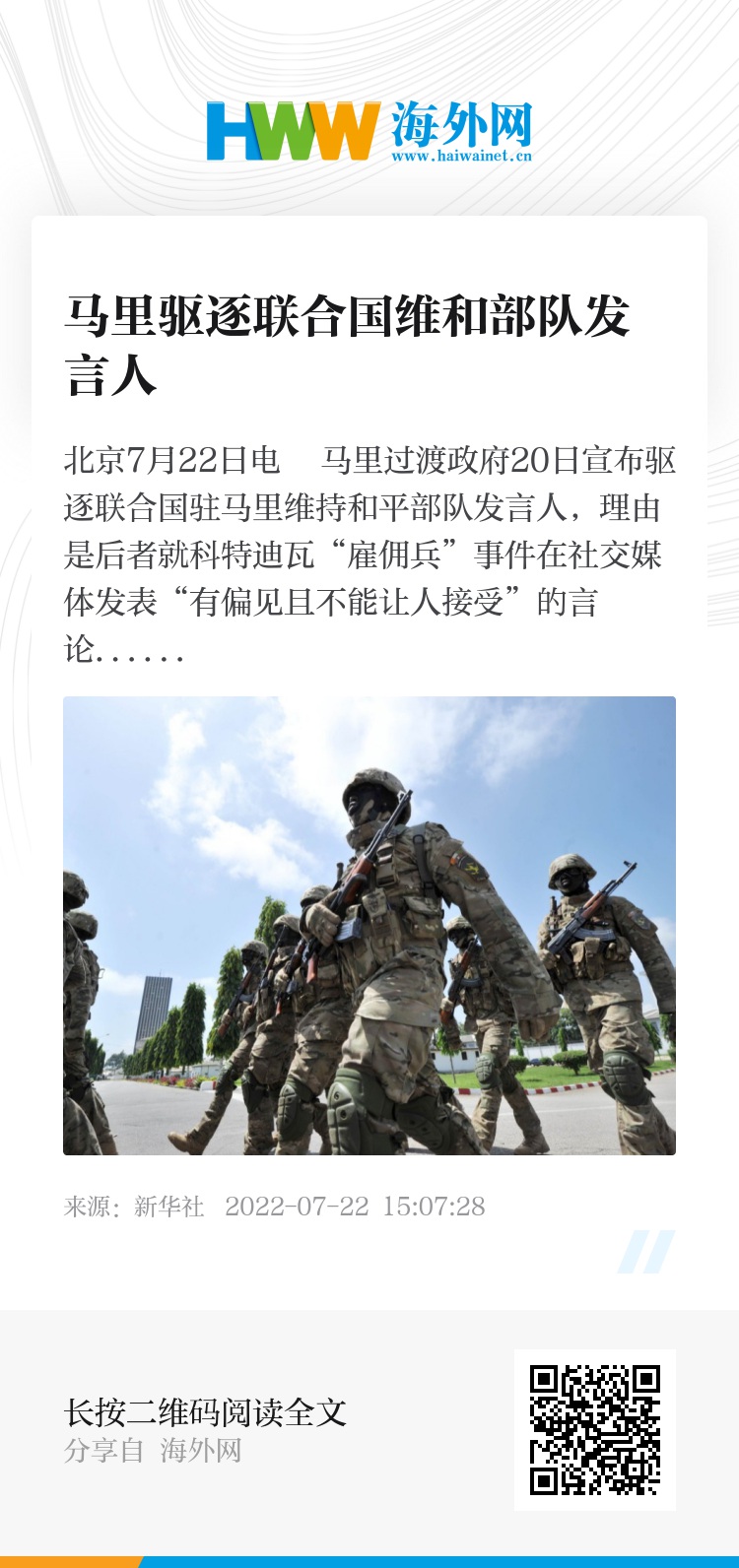 新华社北京7月22日电 马里过渡政府20日宣布驱逐联合国驻马里维持和平部队发言人,理由是后者就科特迪瓦“雇佣兵”事件在社交媒体发表“有偏见且不能让人接受”的言论。