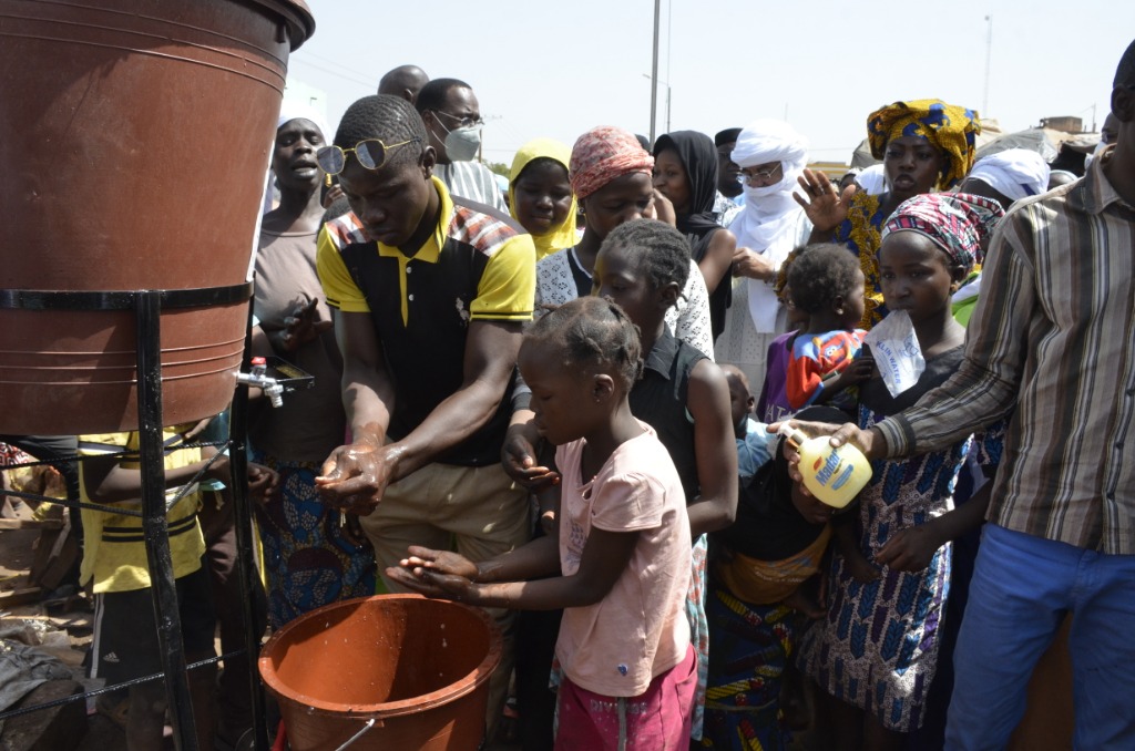 2020年4月3日,人们在马里首都巴马科市中心的一处市场的洗手装置处洗手。马里政府为抗击新冠疫情,在不少公共场所安置了简易的洗手装置,方便人们洗手。新华社发(哈比卜·库亚特摄)