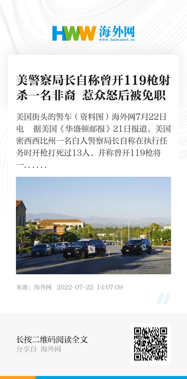 海外网7月22日电 据美国《华盛顿邮报》21日报道,美国密西西比州一名白人警察局长自称在执行任务时开枪打死过13人,并称曾开119枪将一名黑人射杀。在引发轩然大波后,这名警察局长已于20日被罢免。