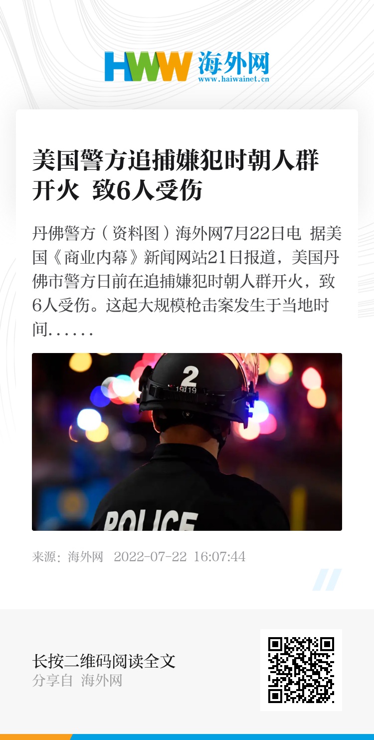 海外网7月22日电 据美国《商业内幕》新闻网站21日报道,美国丹佛市警方日前在追捕嫌犯时朝人群开火,致6人受伤。