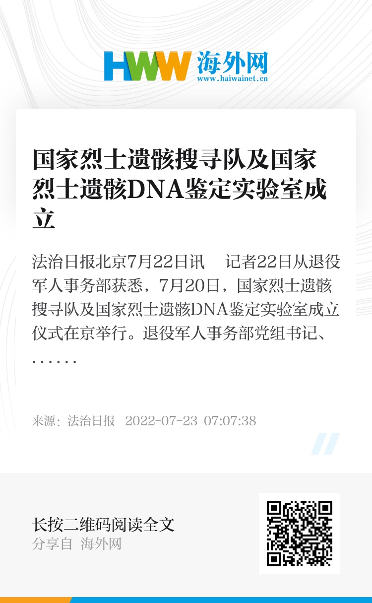 法治日报北京7月22日讯 记者22日从退役军人事务部获悉,7月20日,国家烈士遗骸搜寻队及国家烈士遗骸DNA鉴定实验室成立仪式在京举行。