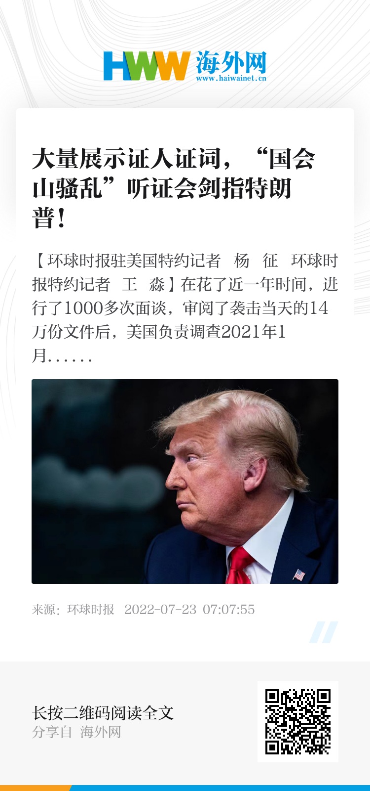 【环球时报驻美国特约记者 杨 征 环球时报特约记者 王 淼】在花了近一年时间,进行了1000多次面谈,审阅了袭击当天的14万份文件后,美国负责调查2021年1月6日国会山骚乱事件的众议院特别委员会21日晚举行听证会。美国有线电视新闻网(CNN)22日称,听证会所展示的证据表明,时任总统的特朗普没有在暴力事件发生时的187分钟里采取行动。2021年1月6日,数以千计的特朗普支持者冲入美国国会大厦,试图阻止国会证实拜登当选美国总统。