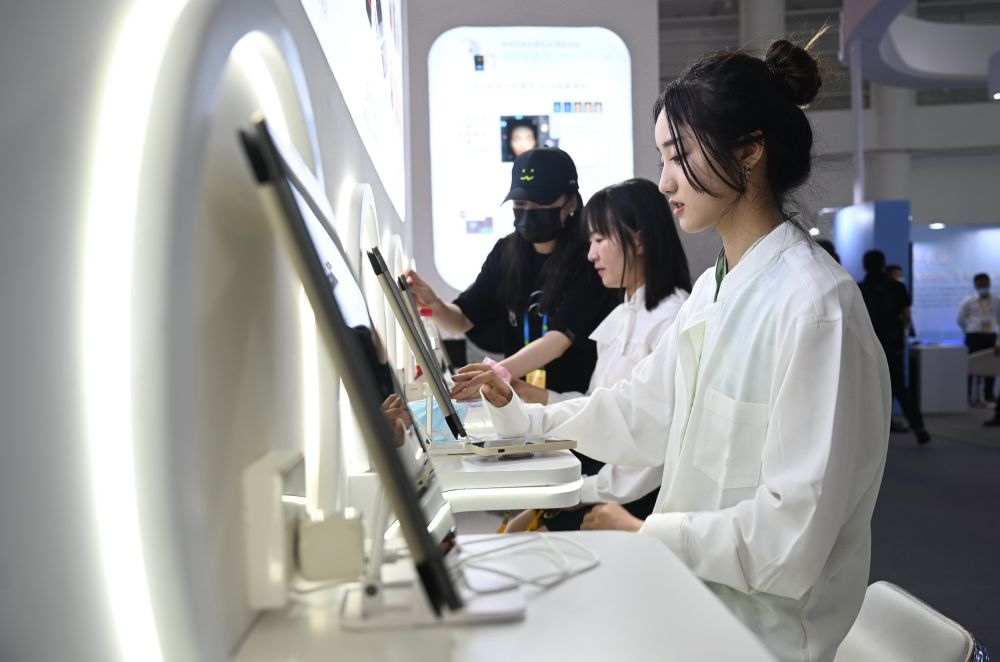 7月22日,参观者在第五届数字中国建设成果展览会上体验虚拟试妆。新华社记者 林善传 摄