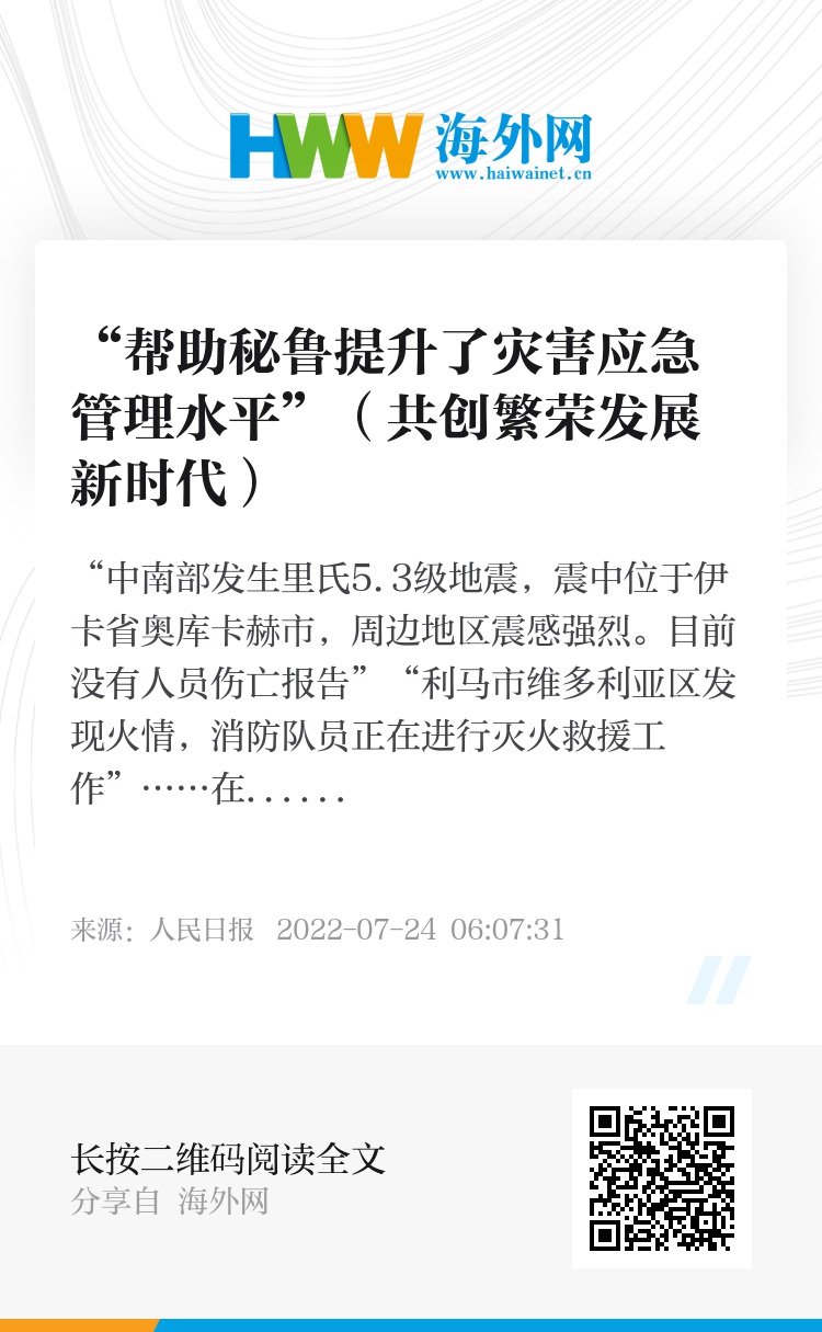“中南部发生里氏5.3级地震,震中位于伊卡省奥库卡赫市,周边地区震感强烈。目前没有人员伤亡报告”“利马市维多利亚区发现火情,消防队员正在进行灭火救援工作”……