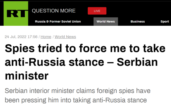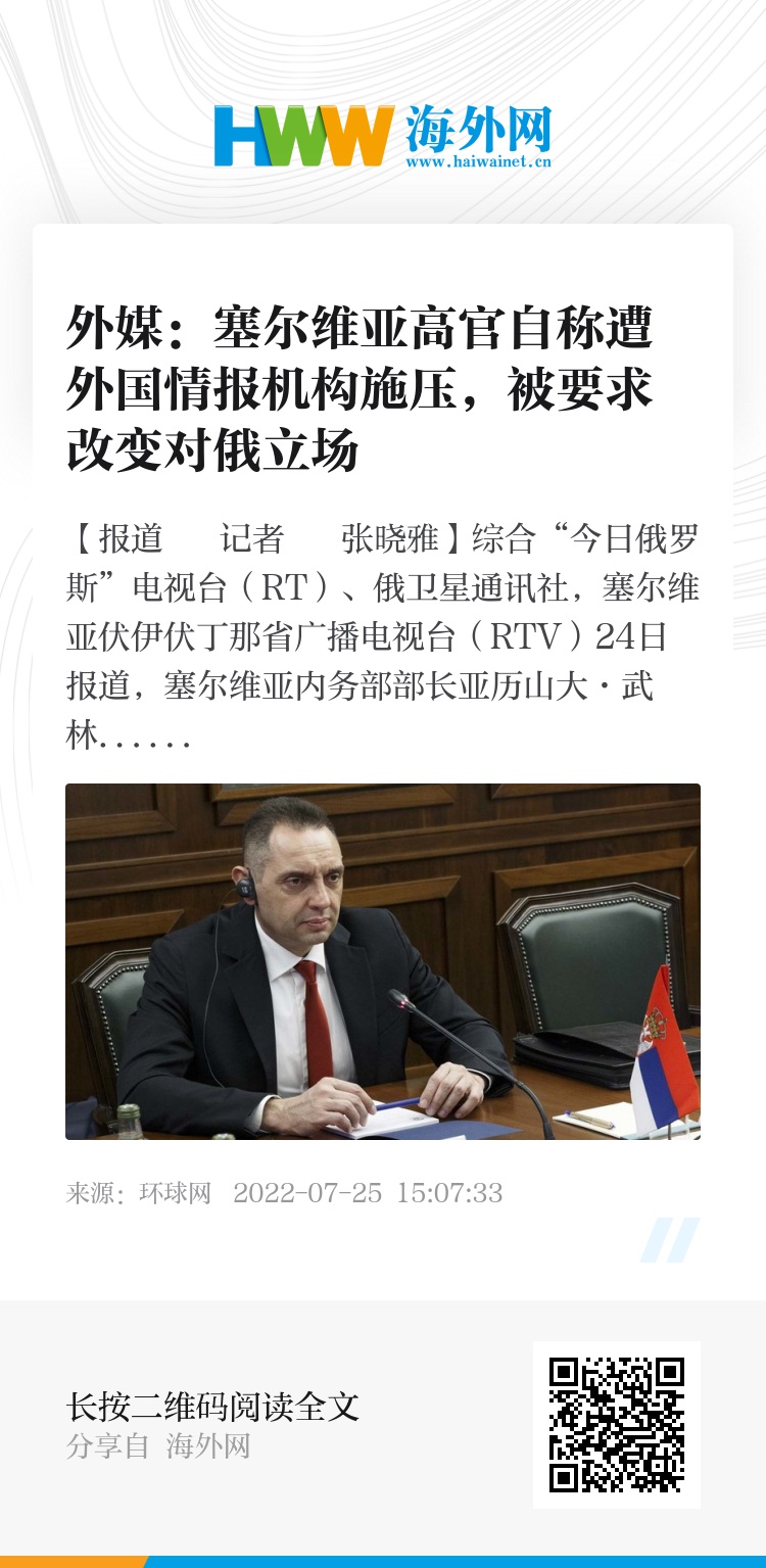 【环球网报道 记者 张晓雅】综合“今日俄罗斯”电视台(RT)、俄卫星通讯社,塞尔维亚伏伊伏丁那省广播电视台(RTV)24日报道,塞尔维亚内务部部长亚历山大·武林接受采访时披露称,“世界上最大的情报机构之一”就其对俄罗斯和中国的立场等对他施压,并将很快展开针对他个人的抹黑行动,目的是不让他顺利进入塞新内阁。