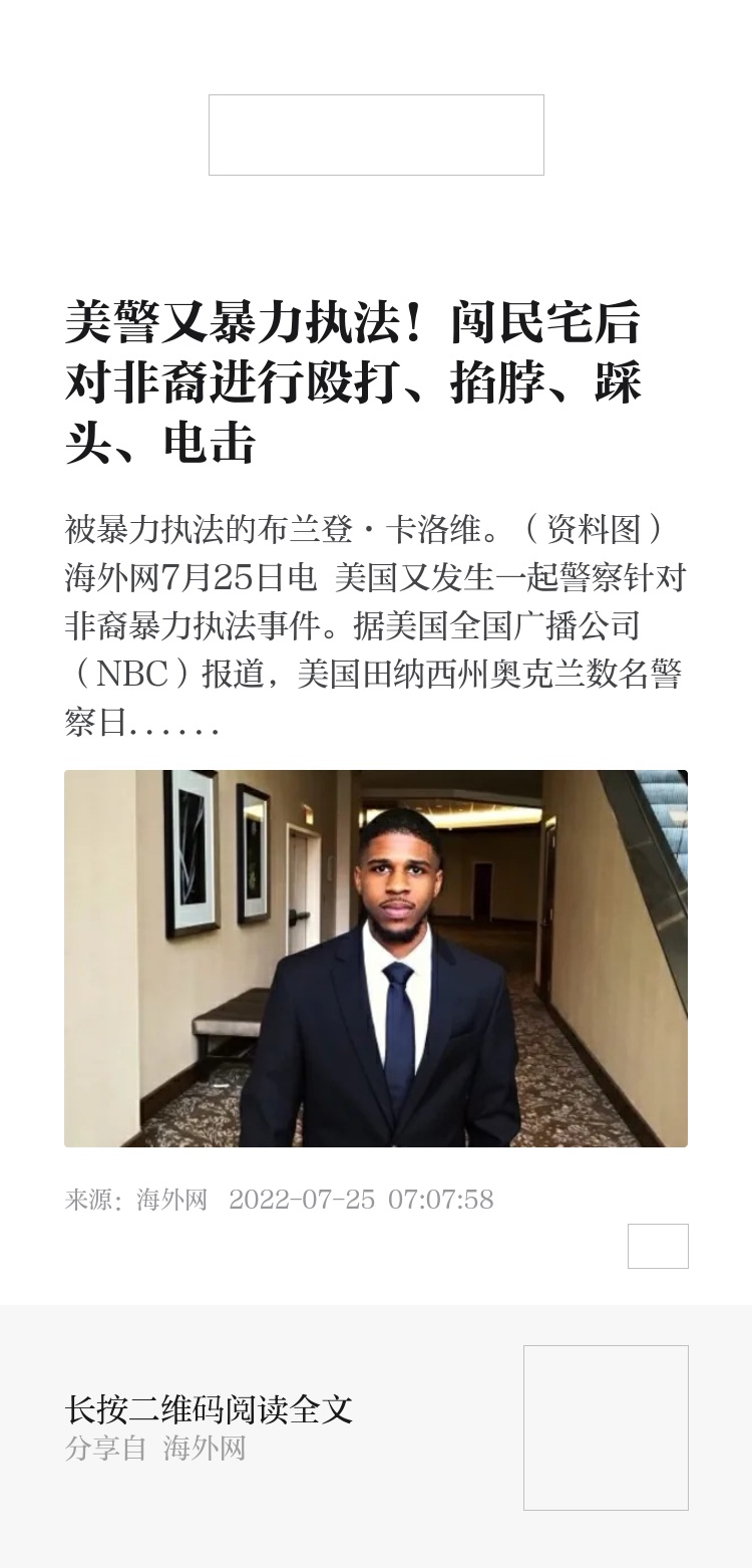 海外网7月25日电 美国又发生一起警察针对非裔暴力执法事件。据美国全国广播公司(NBC)报道,美国田纳西州奥克兰数名警察日前在执法时,对非裔男子布兰登·卡洛维进行殴打、锁肩、踩头、电击,致其满脸是血。