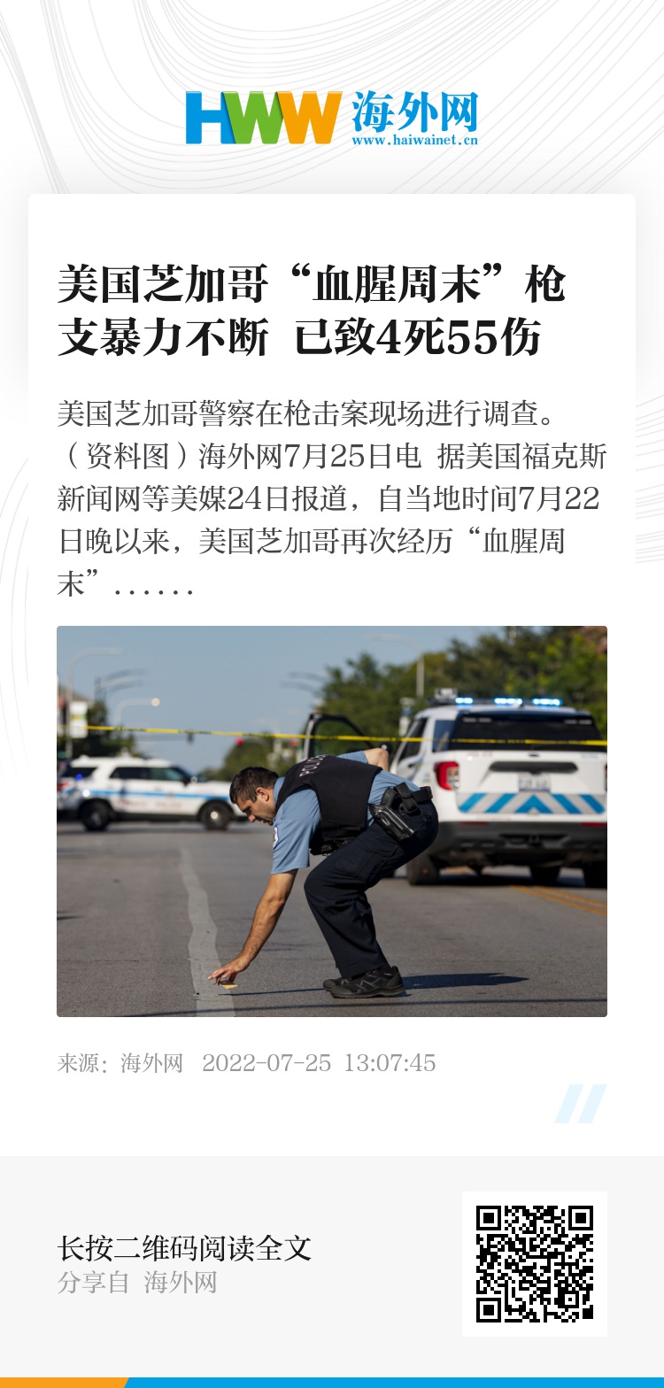 海外网7月25日电 据美国福克斯新闻网等美媒24日报道,自当地时间7月22日晚以来,美国芝加哥再次经历“血腥周末”,枪支暴力案件不断,截至目前已造成4人死亡,55人受伤。