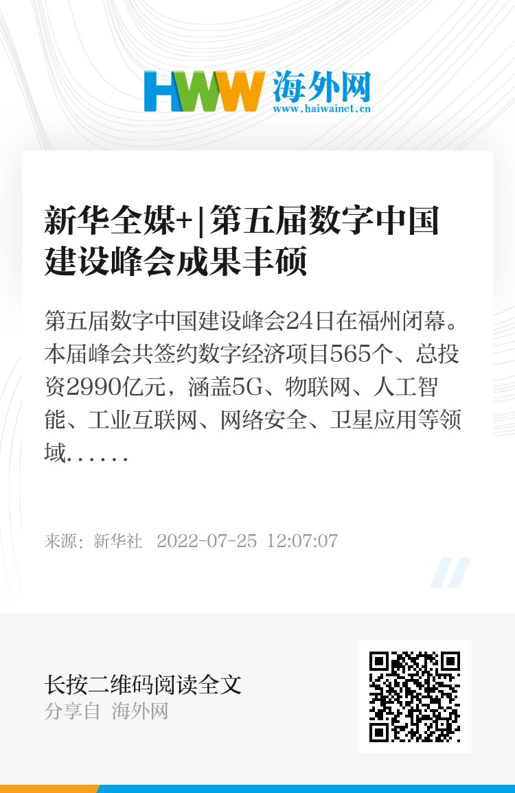 第五届数字中国建设峰会24日在福州闭幕。本届峰会共签约数字经济项目565个、总投资2990亿元,涵盖5G、物联网、人工智能、工业互联网、网络安全、卫星应用等领域,将有力推动我国数字产业化、产业数字化。