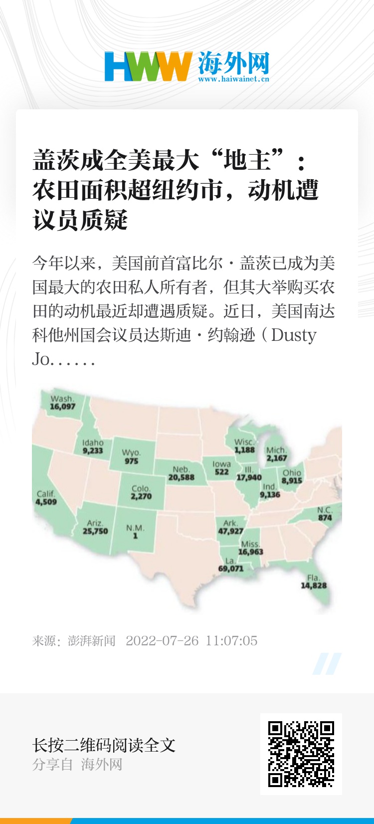 约翰逊在写给美国众议院农业委员会主席大卫·斯科特(David Scott)的信中写道:“我认为,农业委员会不应该忽视盖茨先生在我国大部分地区持有农田股份这个事实。”