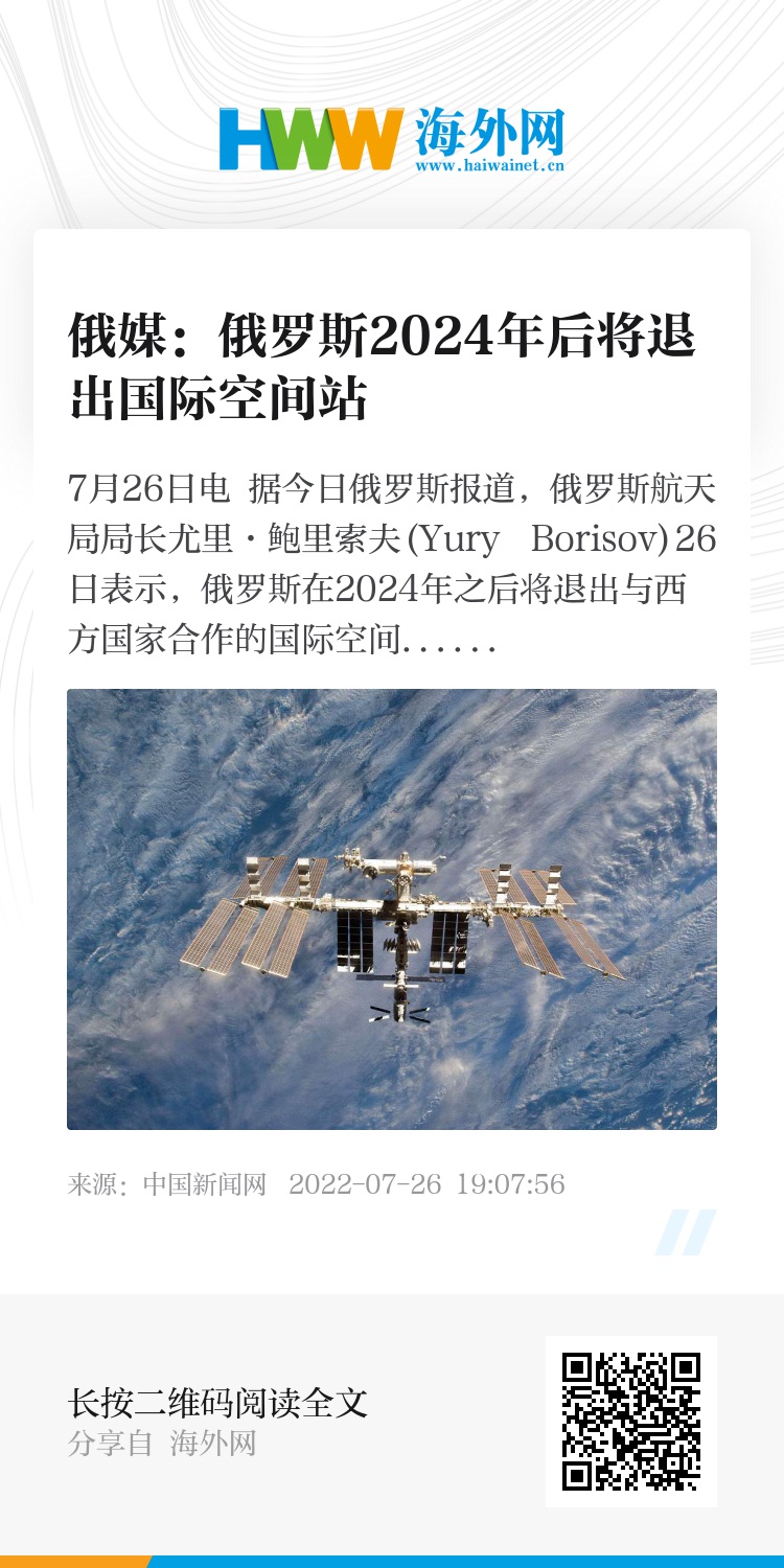 中新网7月26日电 据今日俄罗斯报道,俄罗斯航天局局长尤里·鲍里索夫(Yury Borisov)26日表示,俄罗斯在2024年之后将退出与西方国家合作的国际空间站项目。