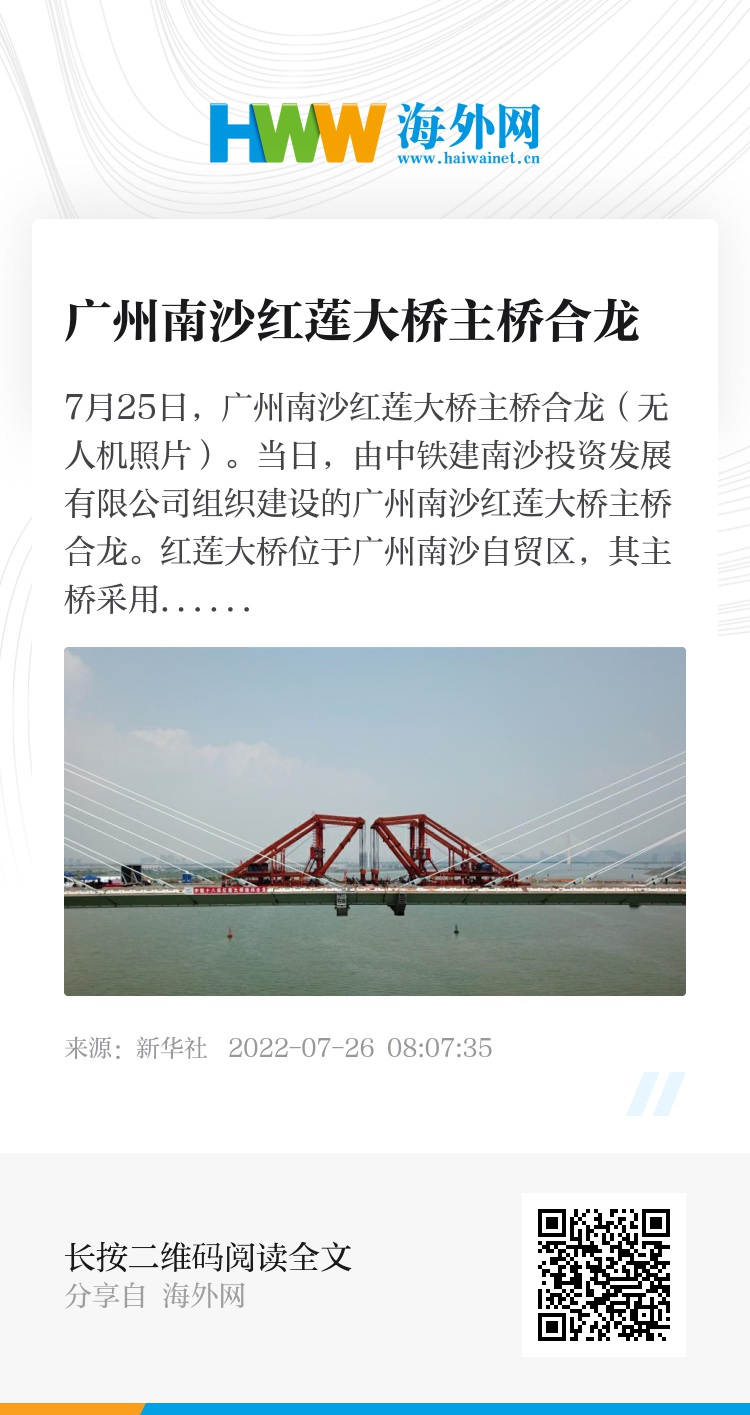 7月25日,广州南沙红莲大桥主桥合龙(无人机照片)。当日,由中铁建南沙投资发展有限公司组织建设的广州南沙红莲大桥主桥合龙。红莲大桥位于广州南沙自贸区,其主桥采用钢箱梁结构,跨度达580米。除了满足车辆和人员通行之外,红莲大桥还承担了高压电缆、燃气、通信和输水管道的随桥过江功能。(新华社记者 黄国保 摄)