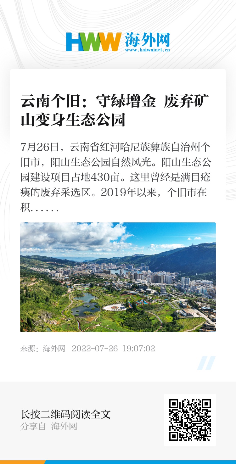 7月26日,云南省红河哈尼族彝族自治州个旧市,阳山生态公园自然风光。阳山生态公园建设项目占地430亩。这里曾经是满目疮痍的废弃采选区。2019年以来,个旧市在积极进行生态修复及环境治理的同时,实施复绿补绿工程,将工业废弃矿山采选区打造成生态公园,既绿化美化了城市,改善了生态环境,又为市民提供了一处休闲、健身、娱乐的好去处。图片来源:视觉中国