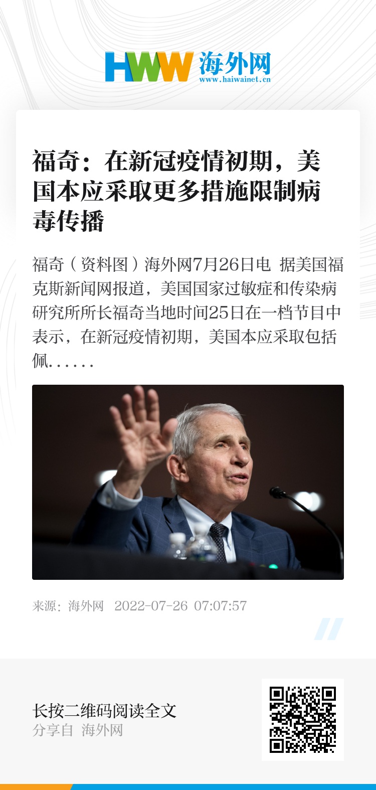 海外网7月26日电 据美国福克斯新闻网报道,美国国家过敏症和传染病研究所所长福奇当地时间25日在一档节目中表示,在新冠疫情初期,美国本应采取包括佩戴口罩在内的更多限制措施来对抗病毒传播。