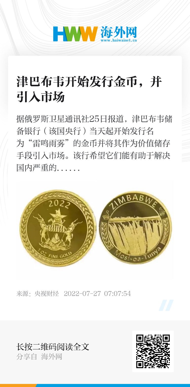 据俄罗斯卫星通讯社25日报道,津巴布韦储备银行(该国央行)当天起开始发行名为“雷鸣雨雾”的金币并将其作为价值储存手段引入市场。