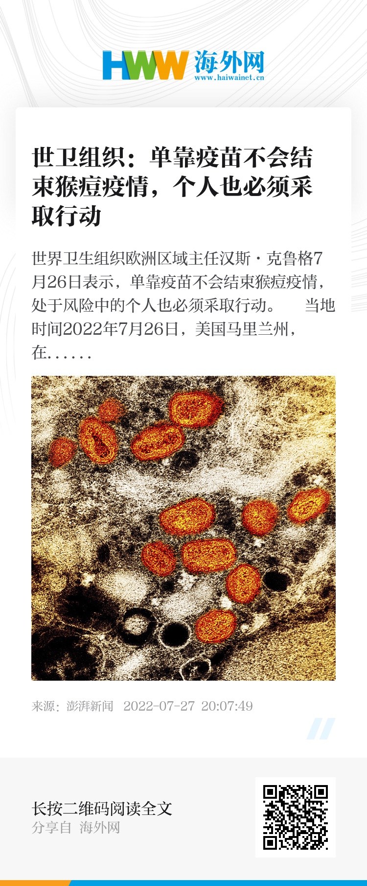世界卫生组织欧洲区域主任汉斯·克鲁格7月26日表示,单靠疫苗不会结束猴痘疫情,处于风险中的个人也必须采取行动。